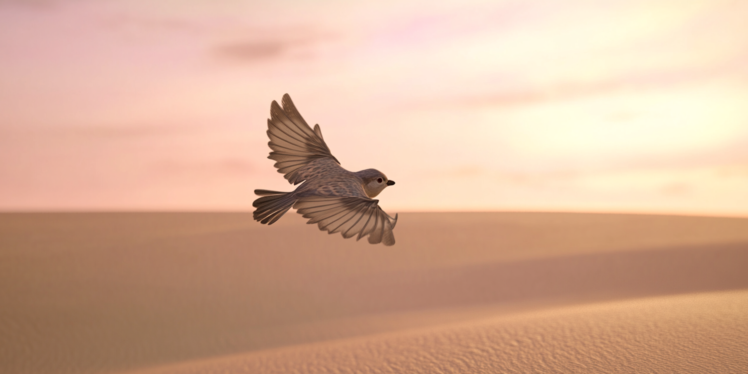 A bird in flight over desert dunes at sunset, with a pastel sky creating a serene and tranquil atmosphere.