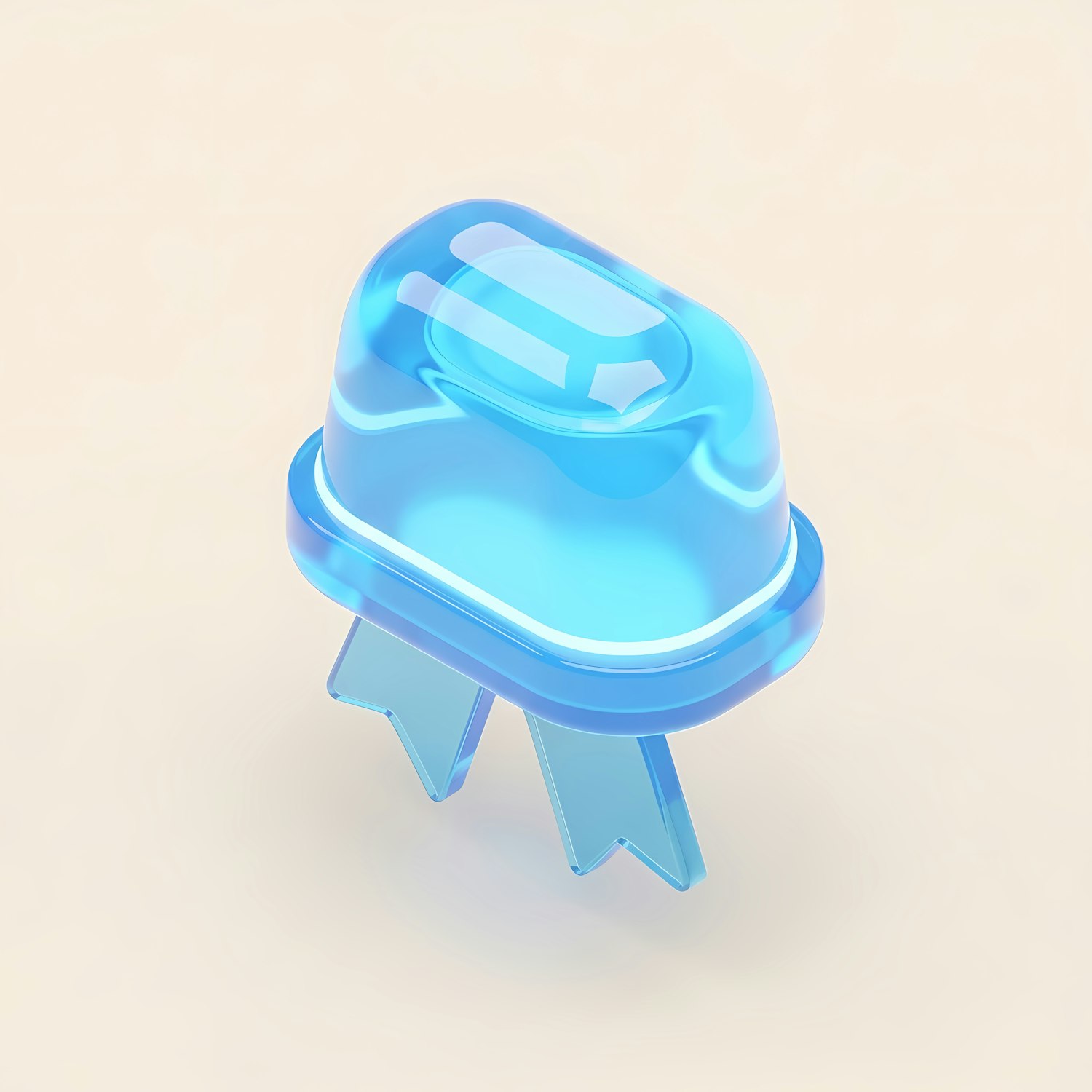 A 3D-rendered translucent blue badge with a glossy finish and ribbon-like extensions, set against a soft beige background.