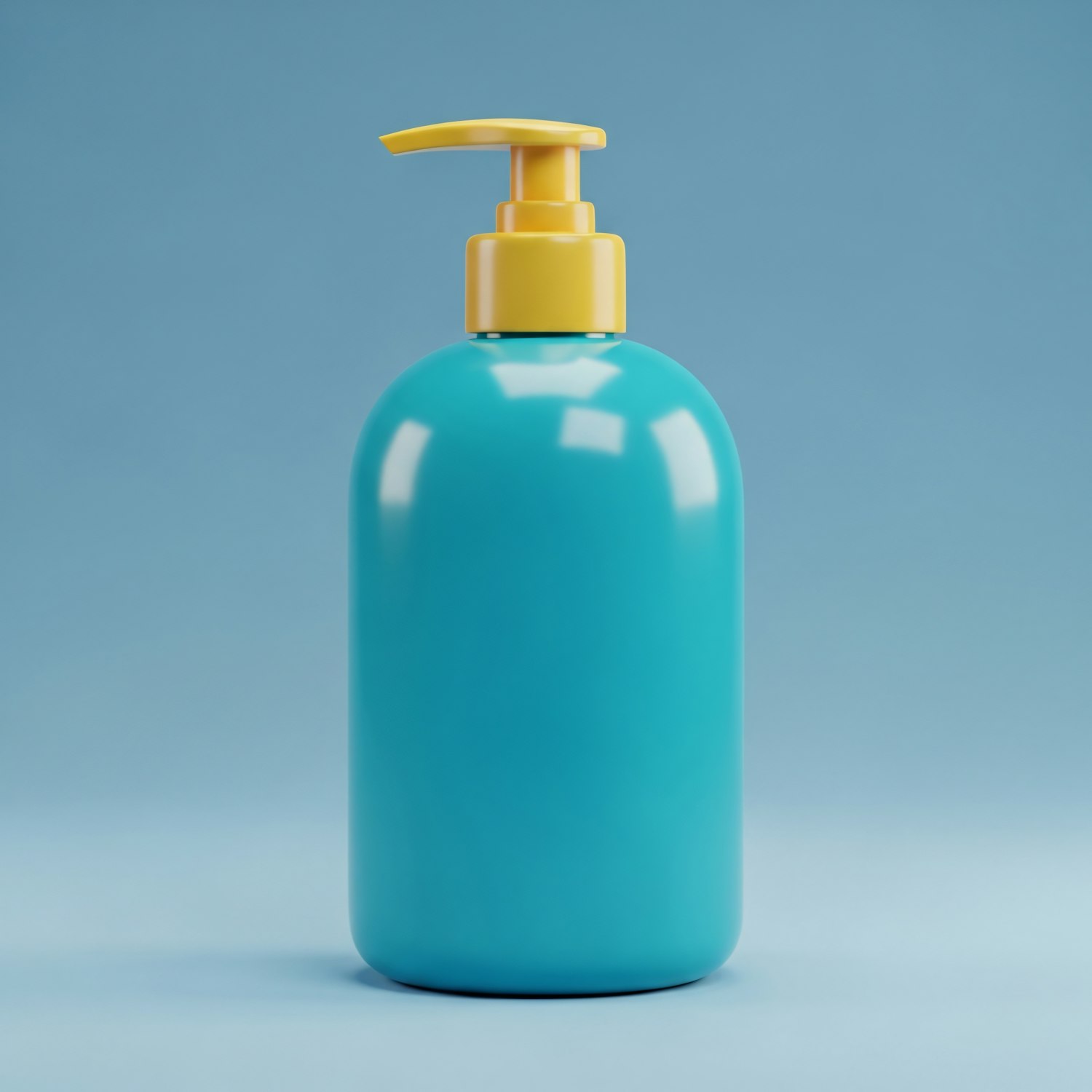A sleek blue bottle with a yellow pump dispenser, set against a clean blue background, showcasing a modern and minimalistic design.
