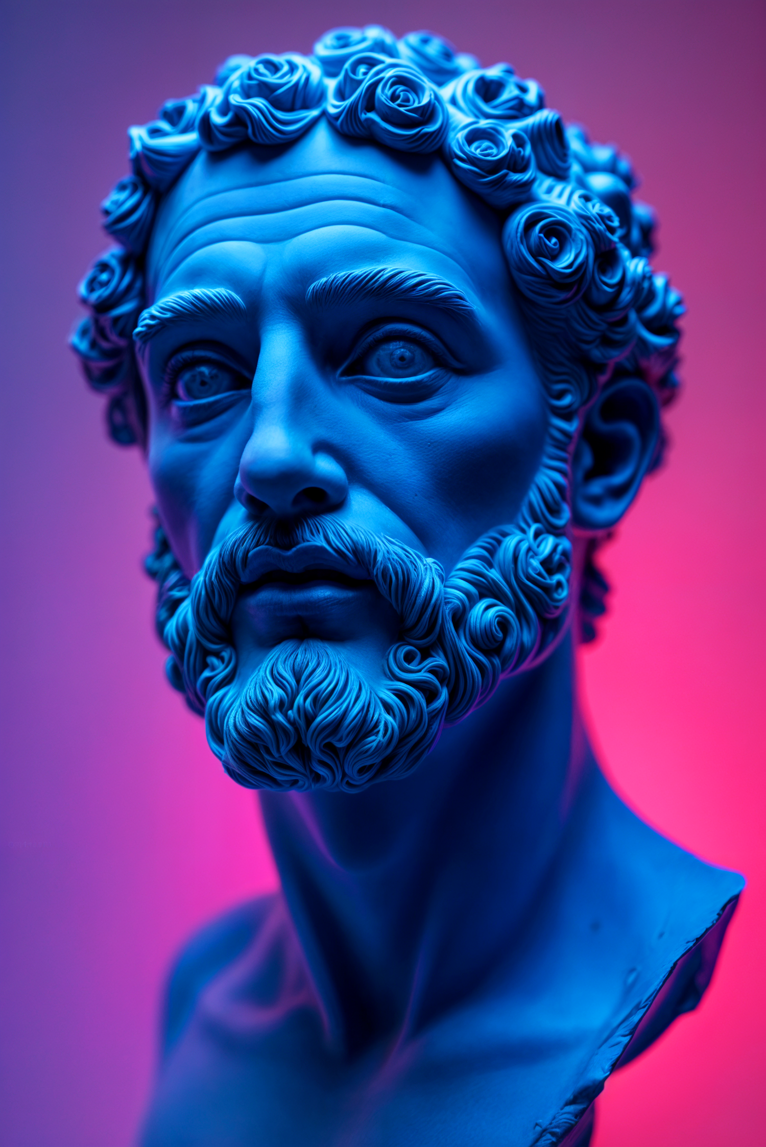 Classical bust illuminated in blue with a pink gradient background, showcasing detailed curls and a lifelike expression.