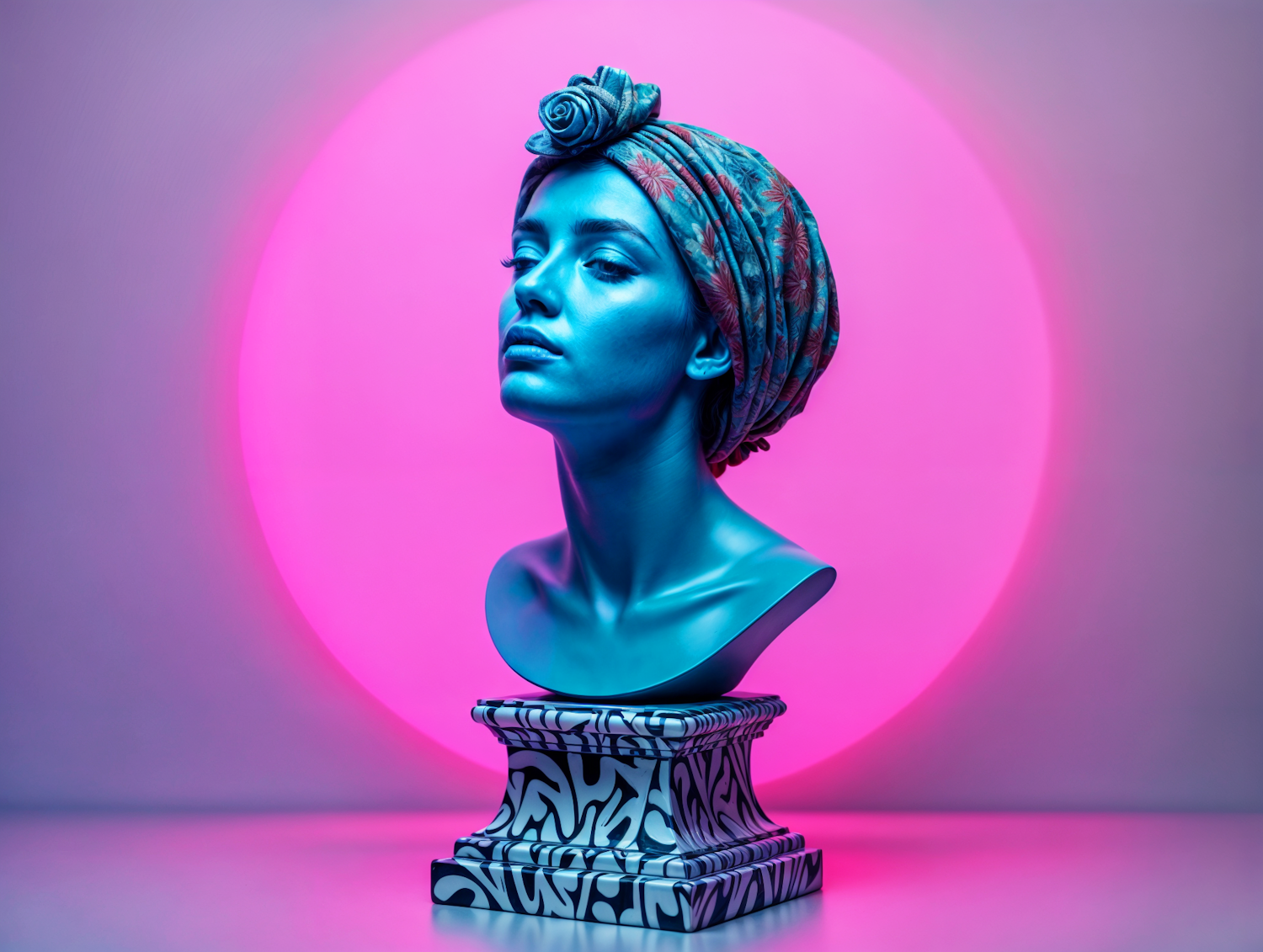 Vibrant blue bust sculpture with a turban against a pink backdrop, featuring a patterned base. A blend of classical and modern art.