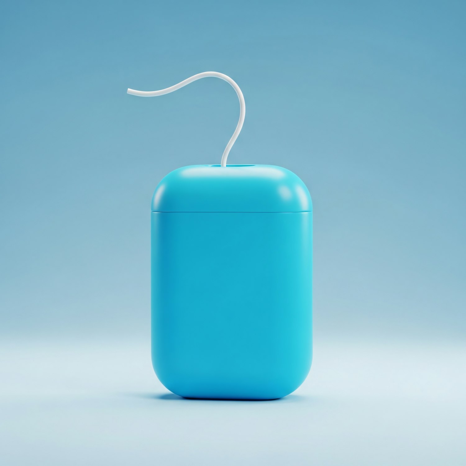A sleek blue container with a white string, rendered in 3D against a soft blue gradient background.