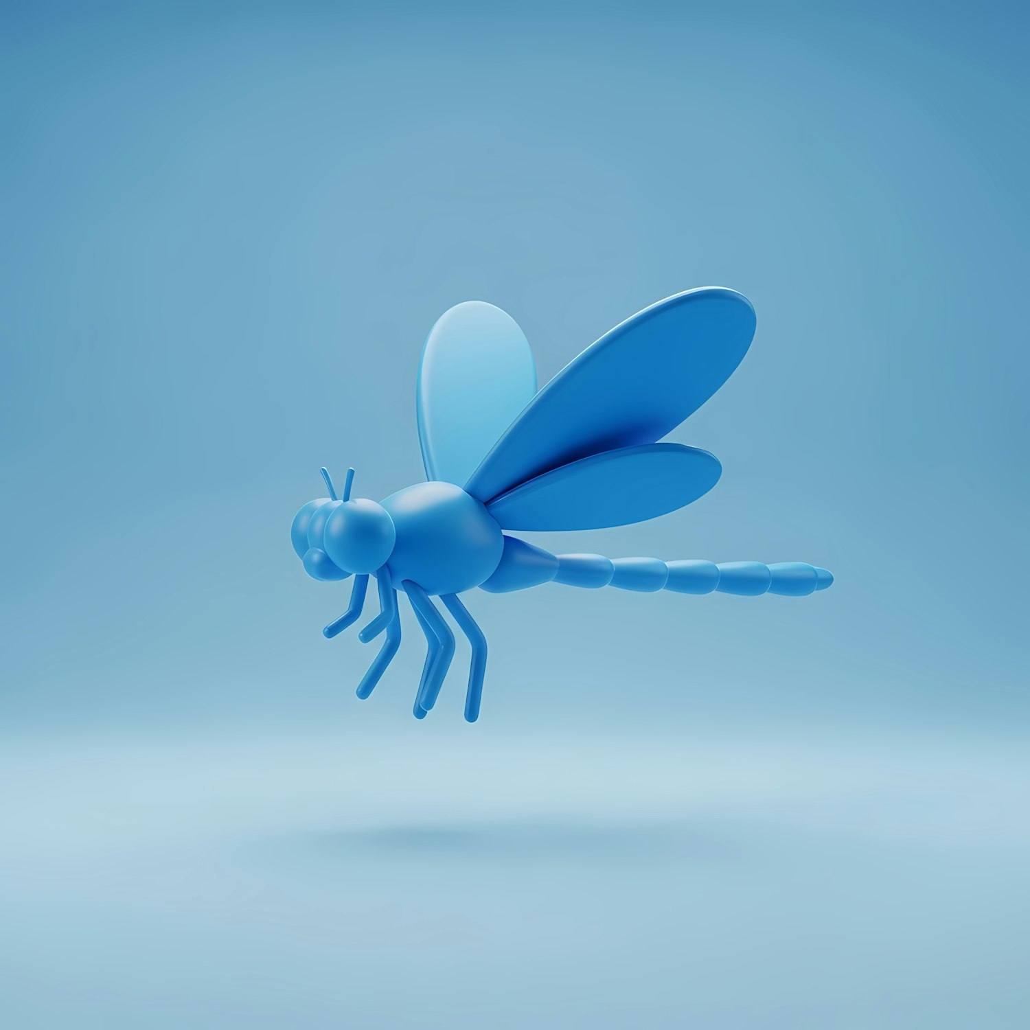 A minimalist 3D blue dragonfly on a gradient blue background, showcasing smooth shapes and a modern design aesthetic.