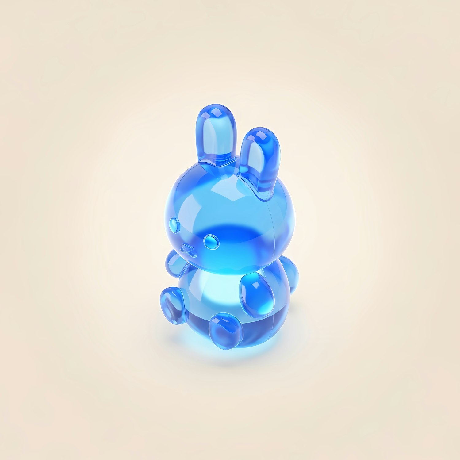 A glossy, translucent blue bunny figurine with a smooth design, set against a light beige background, showcasing its reflective texture.