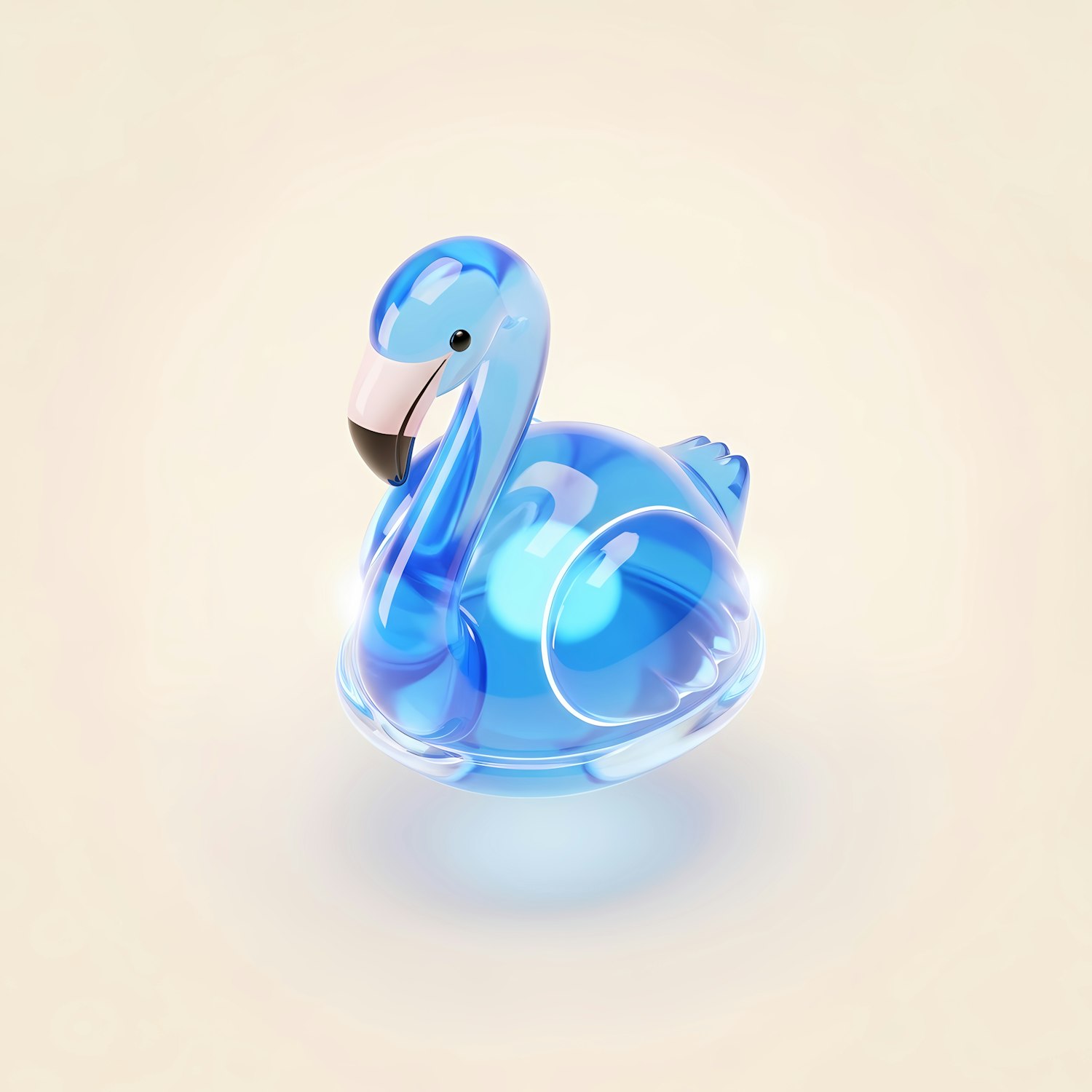 A stunning 3D illustration of a blue glass-like flamingo figurine with a soft beige background, showcasing its elegant and reflective design.