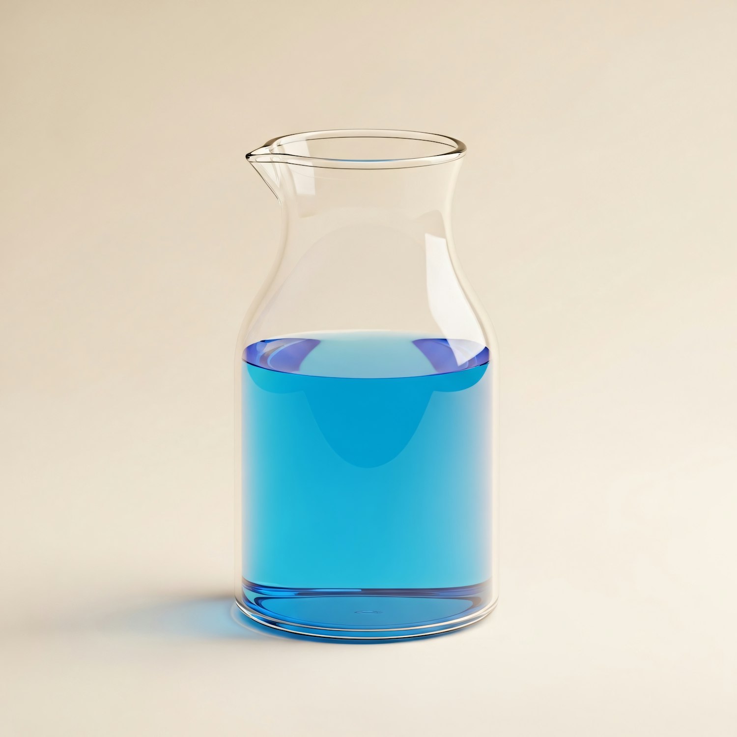 A clear glass carafe filled with bright blue liquid, set against a neutral beige background, creating a clean and minimalistic aesthetic.