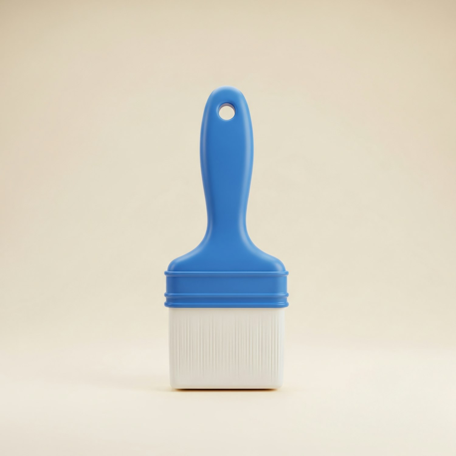 A blue-handled paintbrush with white bristles, set against a neutral background, showcasing its clean and simple design.