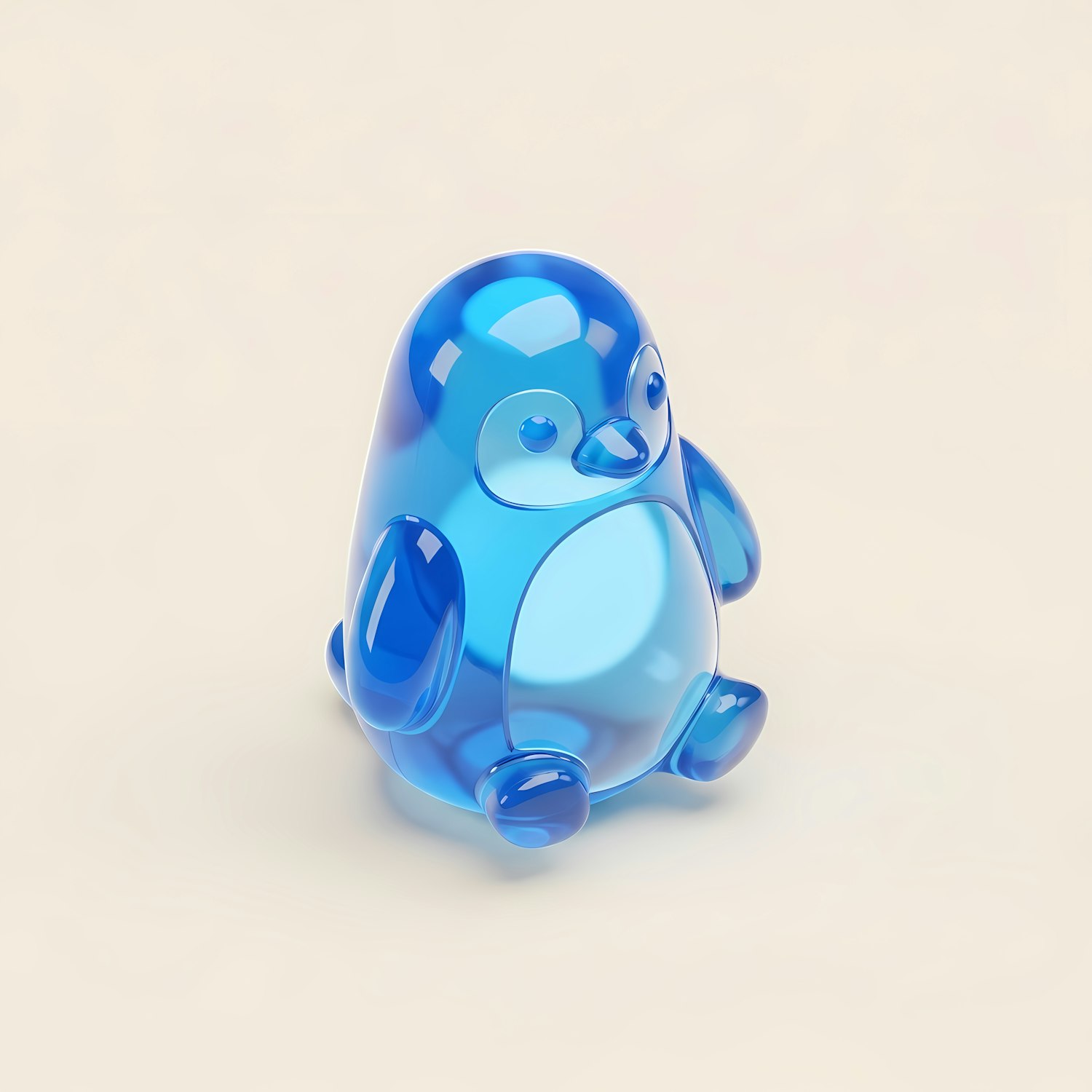 A shiny blue penguin figurine with a smooth, translucent design, set against a neutral background, perfect for modern decor.