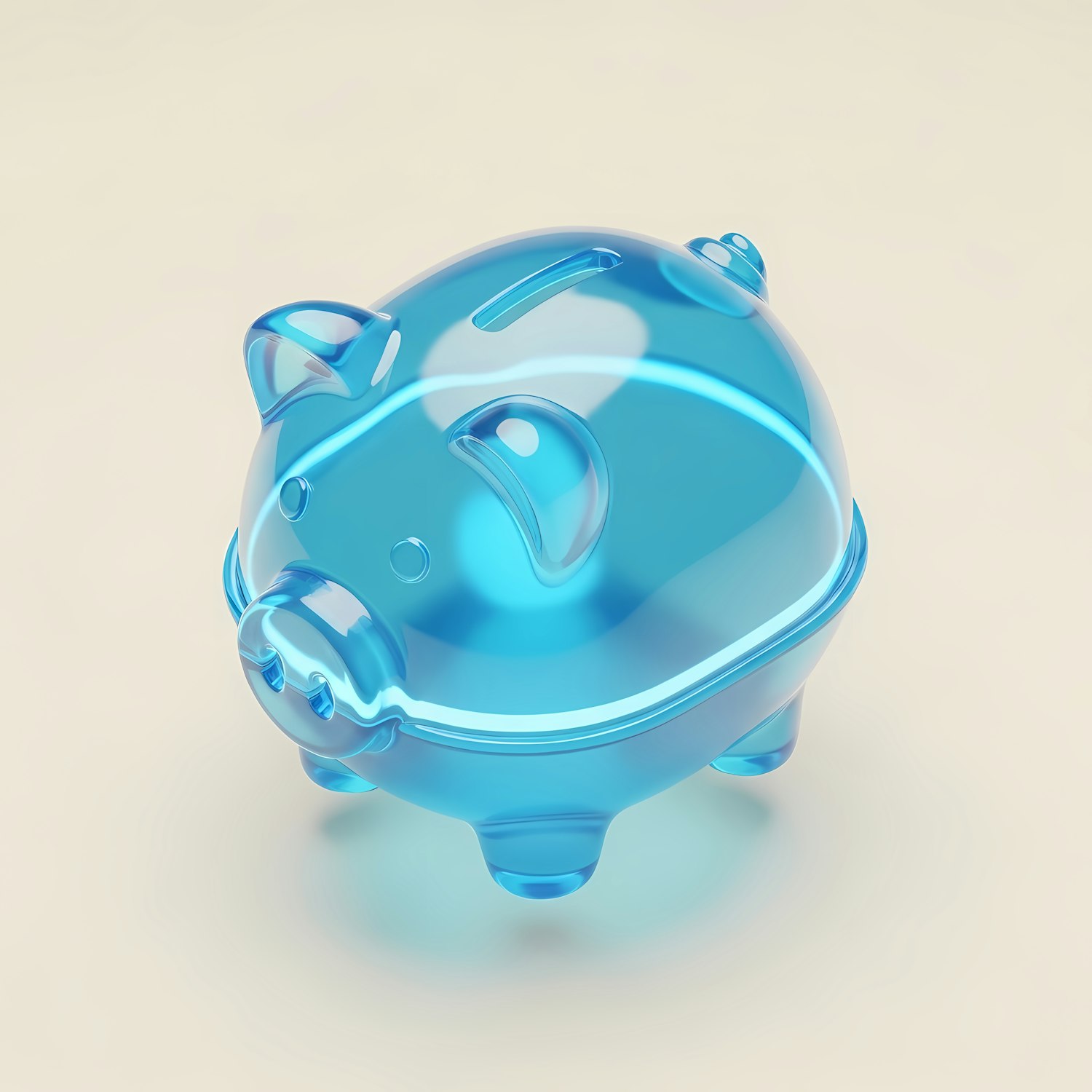 A sleek, translucent blue piggy bank with a modern design, set against a light beige background. Perfect for saving inspiration.