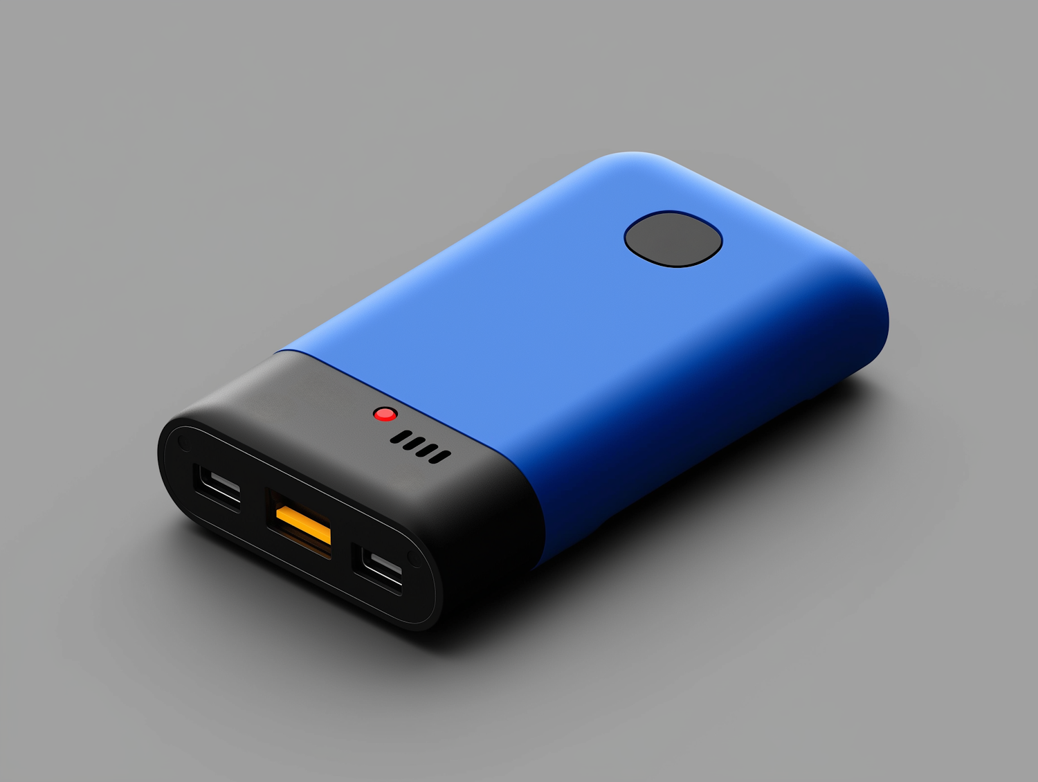 Compact blue and black power bank with multiple USB ports and a red indicator light, perfect for charging devices on the go.