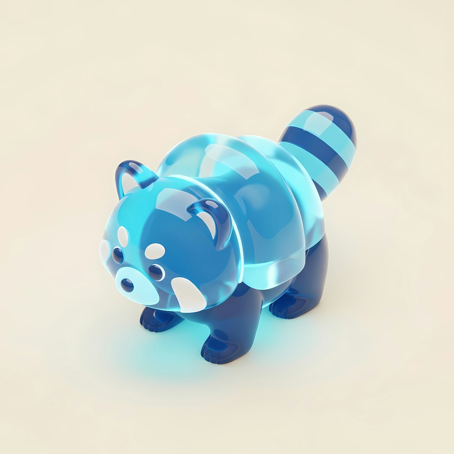 A cute 3D-rendered blue raccoon-like figure with a glossy, translucent finish, set against a soft beige background.