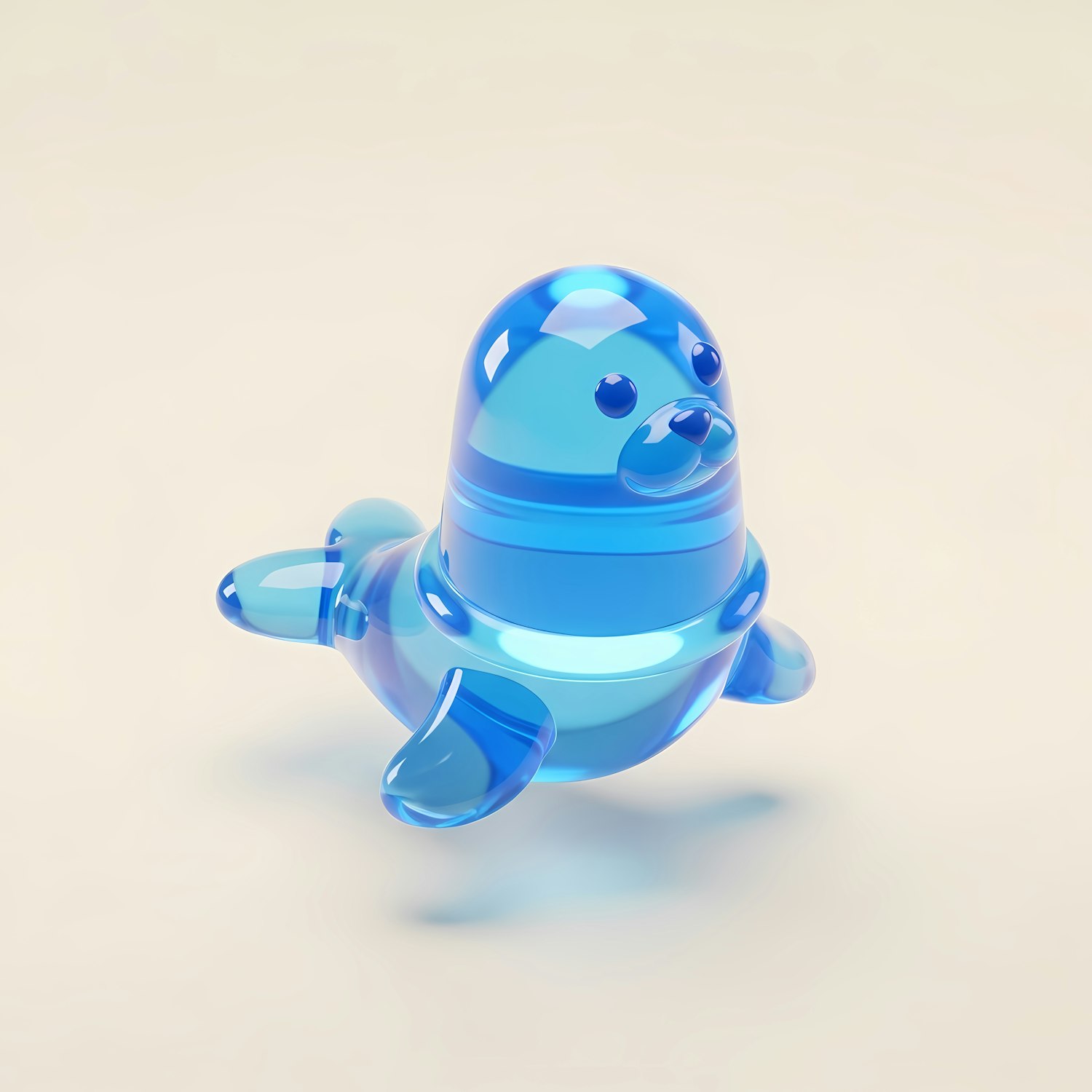 A 3D-rendered translucent blue seal figurine with a glossy finish, set against a neutral beige background, showcasing its playful design.