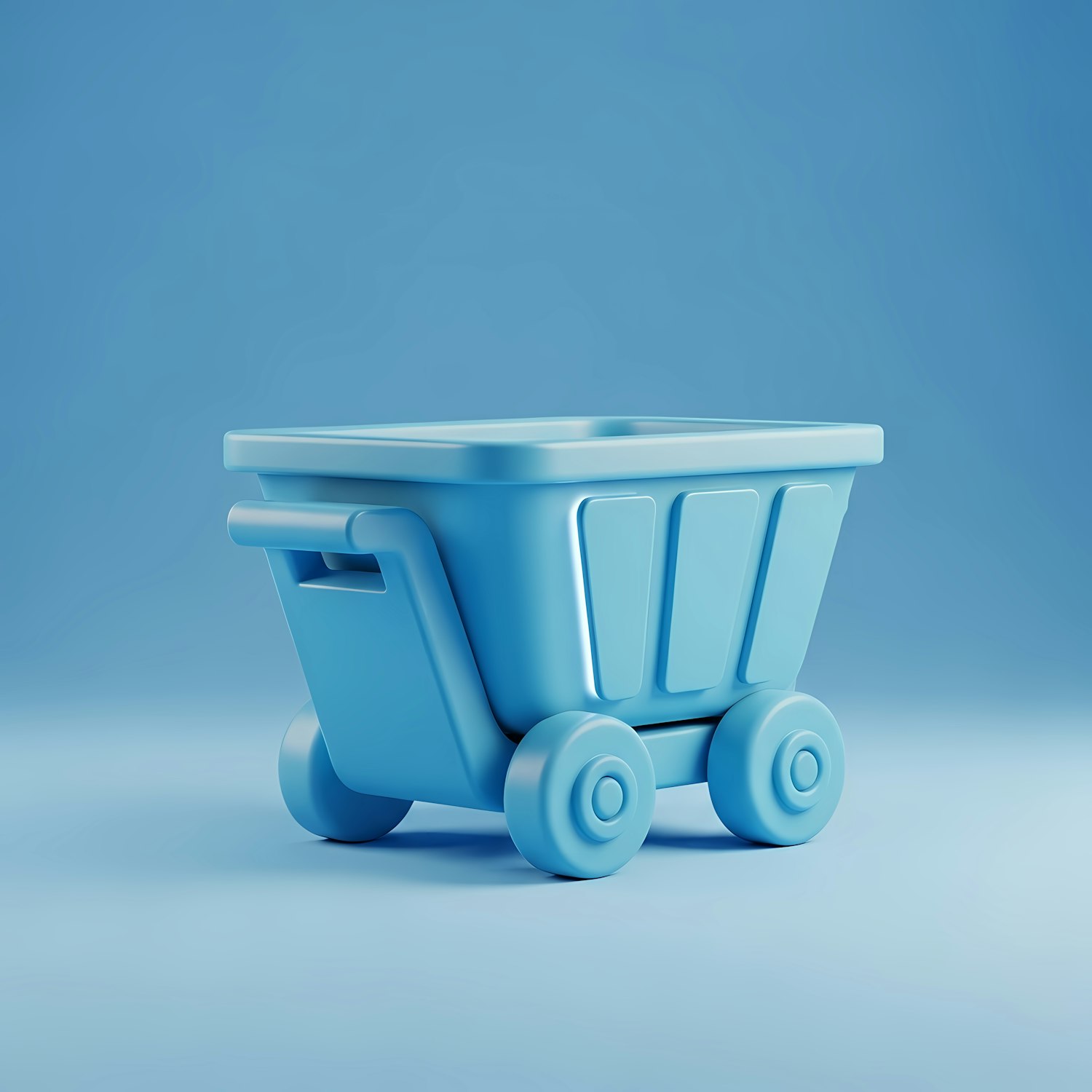 Minimalist 3D-rendered blue shopping cart on a gradient blue background, showcasing a clean and modern design.