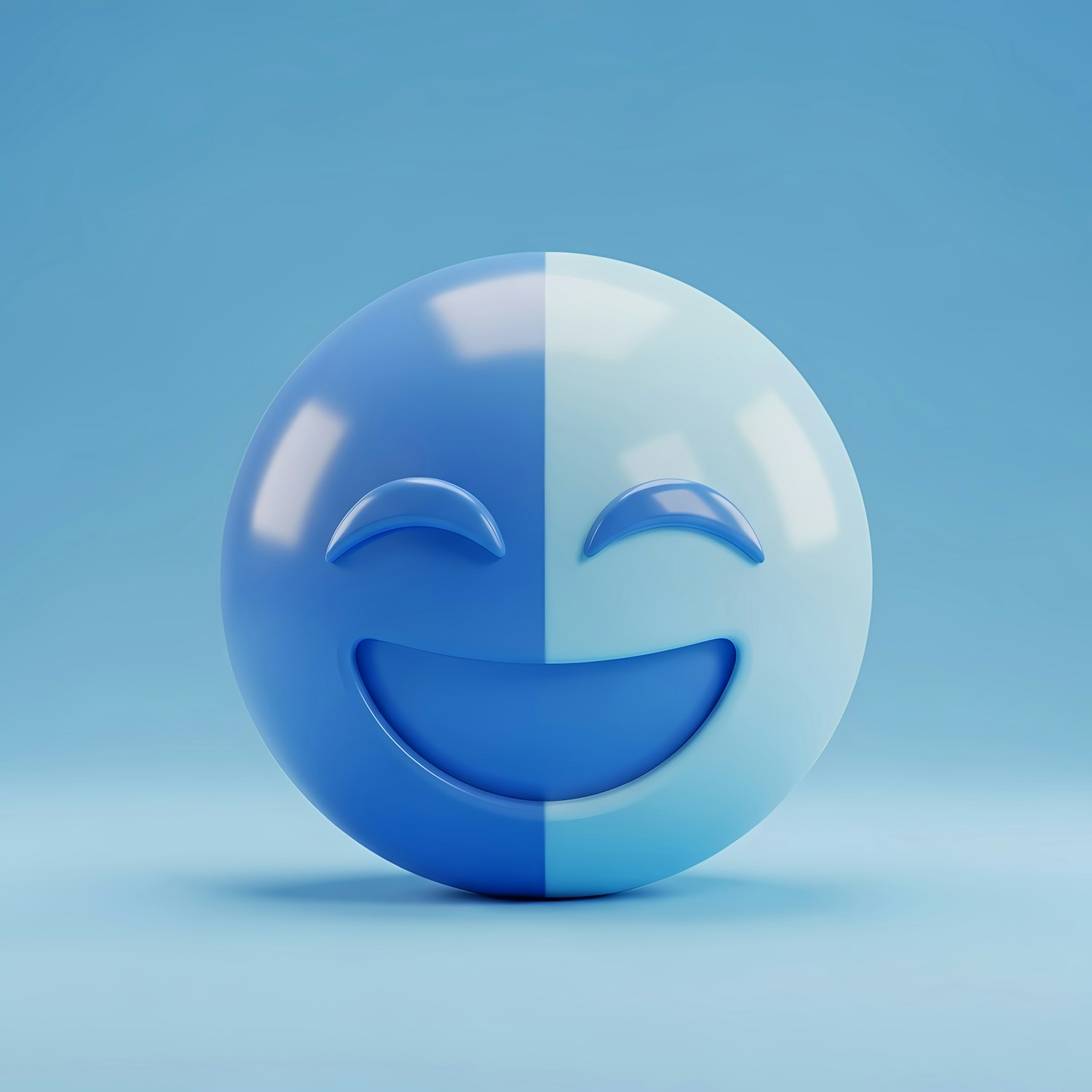 A cheerful 3D smiley face emoji in two-tone blue with a glossy finish, set against a light blue gradient background.