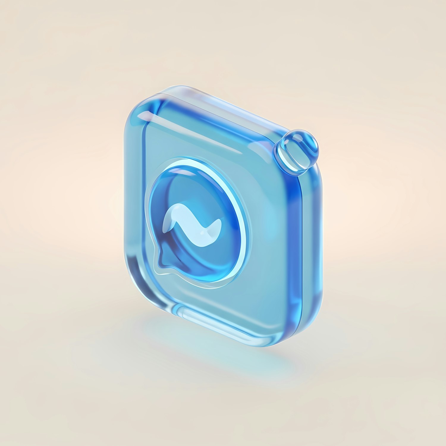 A sleek 3D-rendered blue glass icon with a speech bubble and wave design, set against a soft beige gradient background.