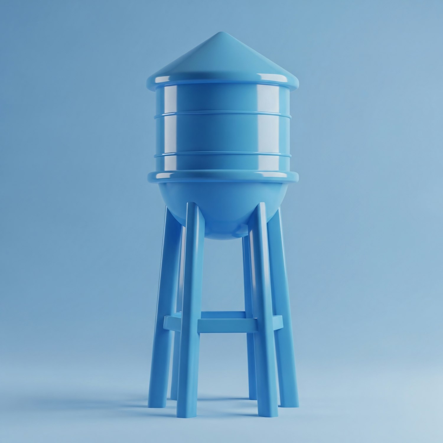 A sleek 3D-rendered blue water tower with a glossy finish, set against a matching blue background for a modern, minimalistic look.