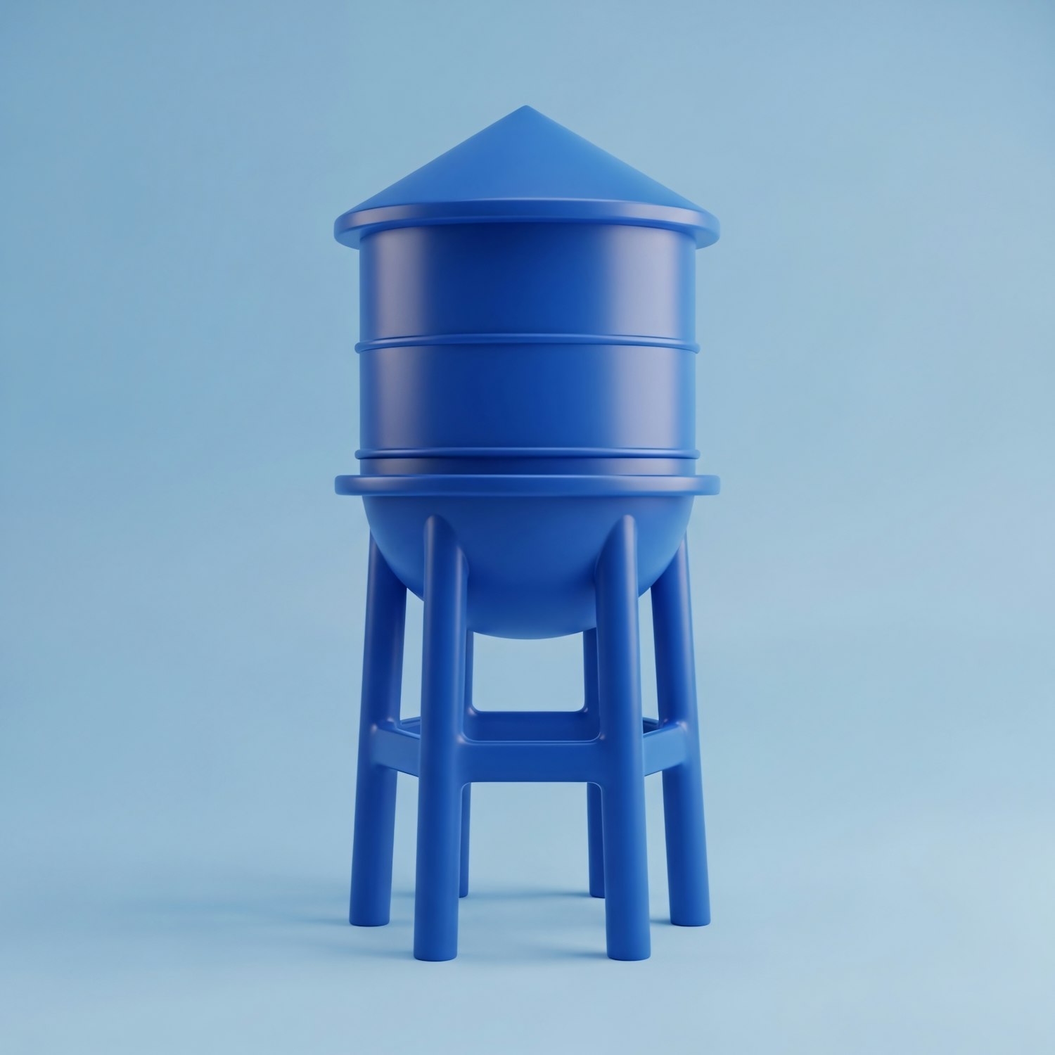 A sleek blue water tower design in a minimalist 3D render, set against a matching blue background for a modern aesthetic.