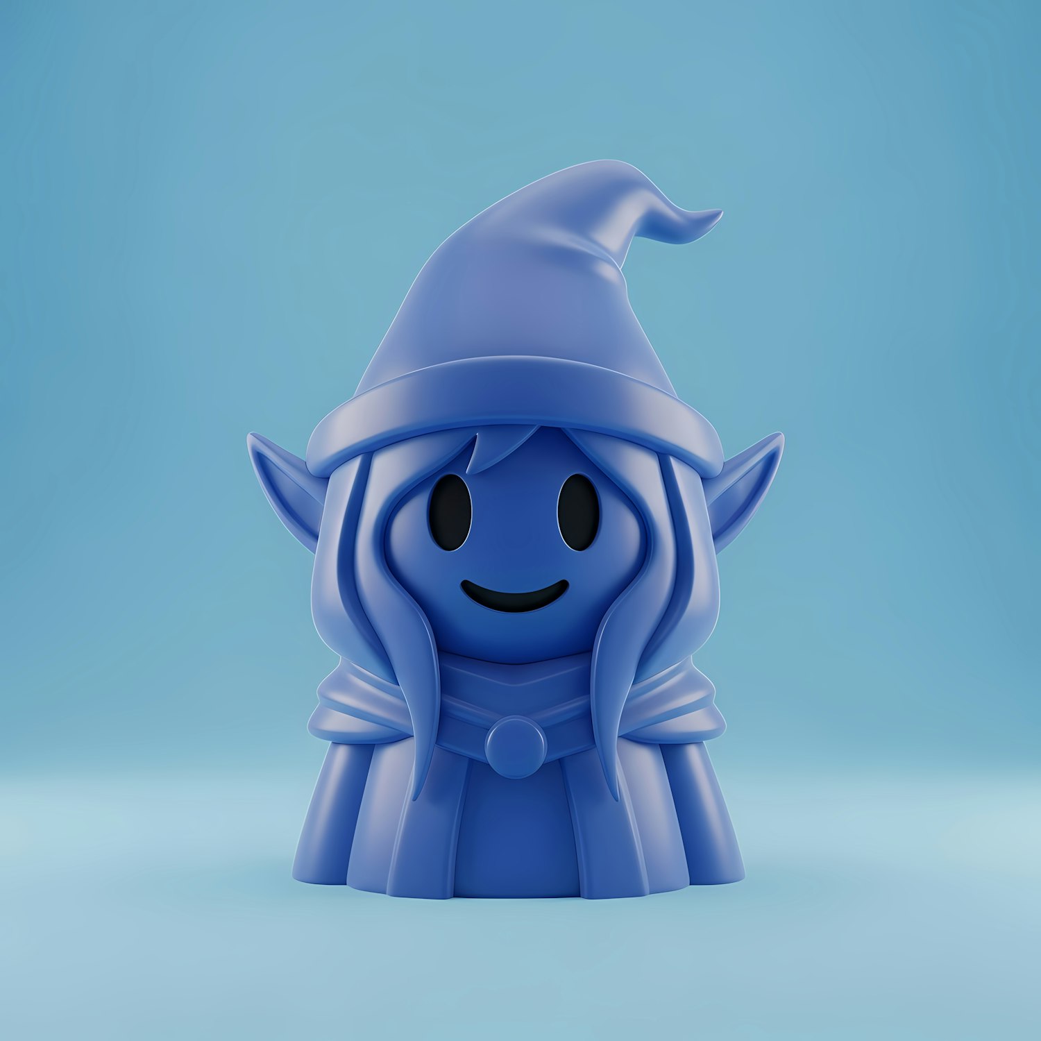 Adorable 3D-rendered blue wizard character with a pointed hat and cloak, set against a light blue background.