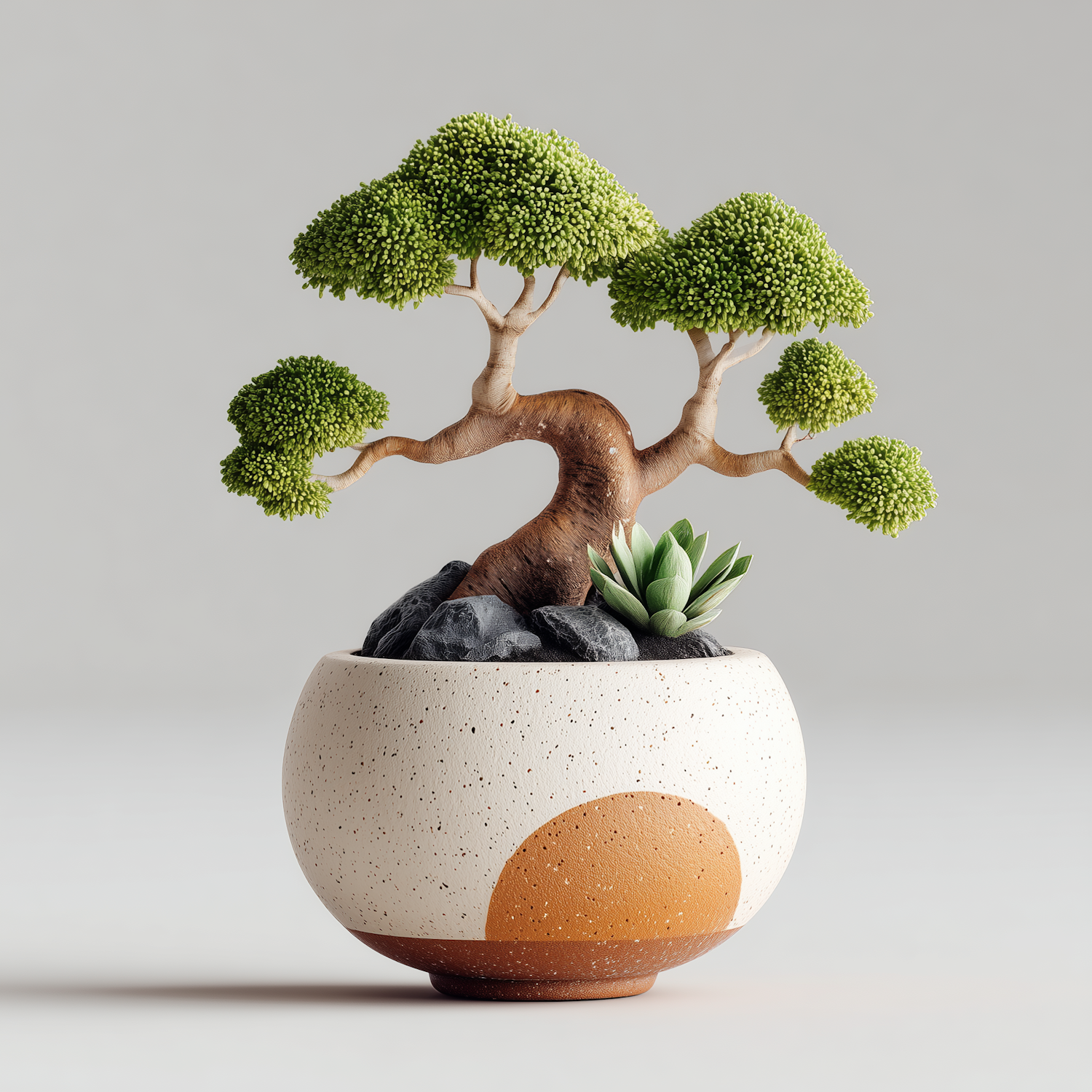 A beautiful bonsai tree in a modern ceramic pot with a minimalist design, featuring lush foliage and a small succulent accent.