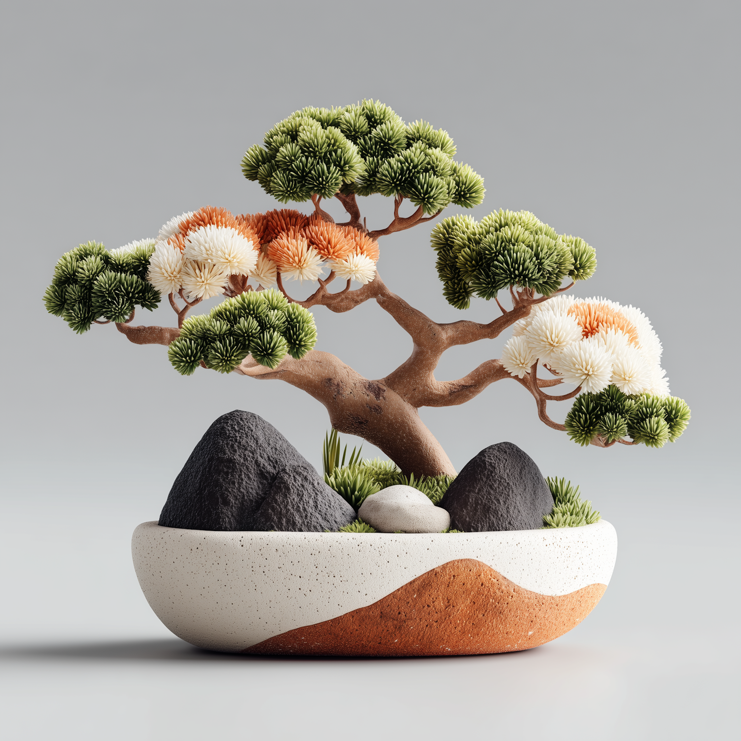 A stunning bonsai tree in a textured pot with vibrant foliage and naturalistic details, set against a neutral background.