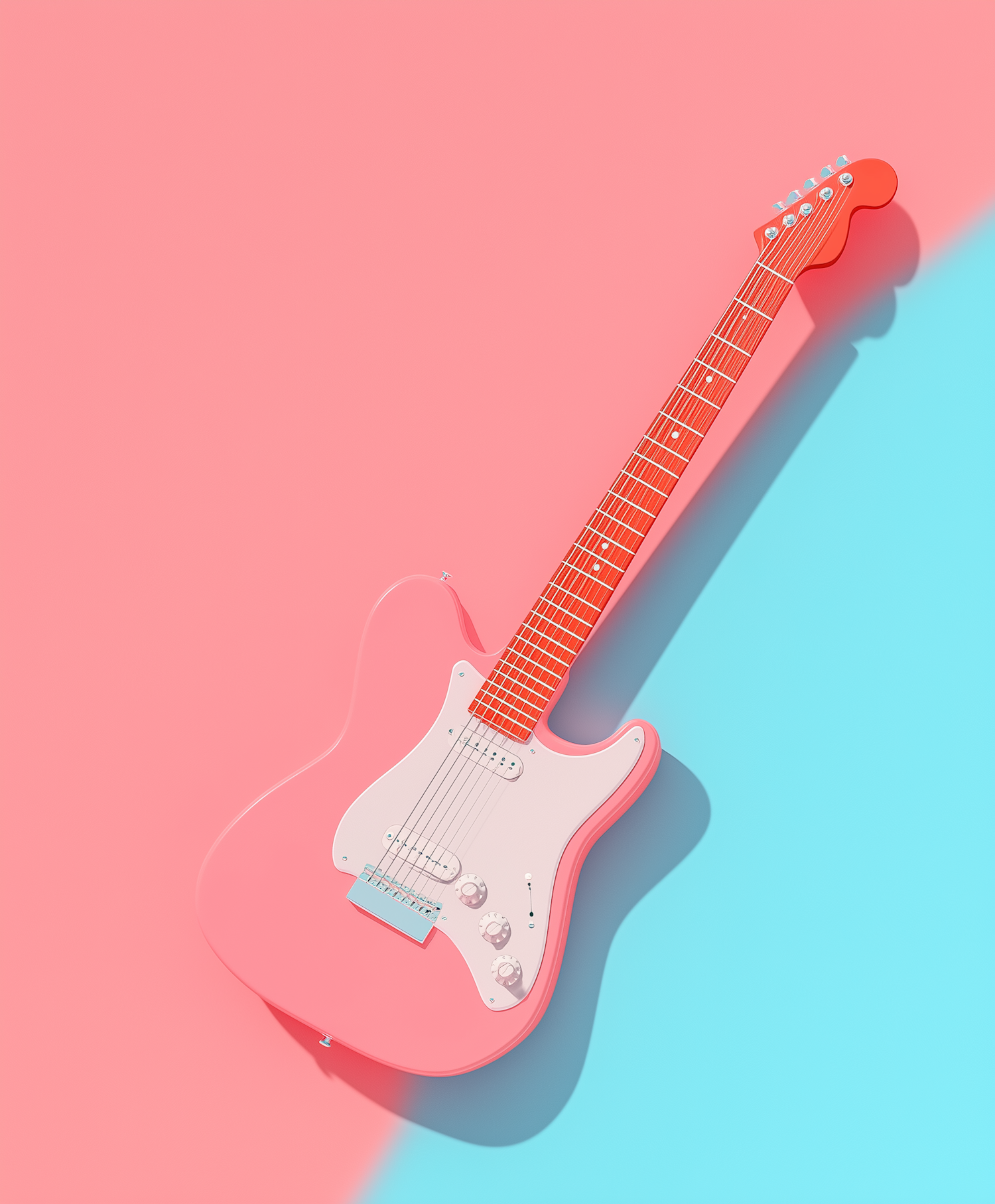 Vibrant pink electric guitar on a split pink and blue background, showcasing bold colors and sleek design.