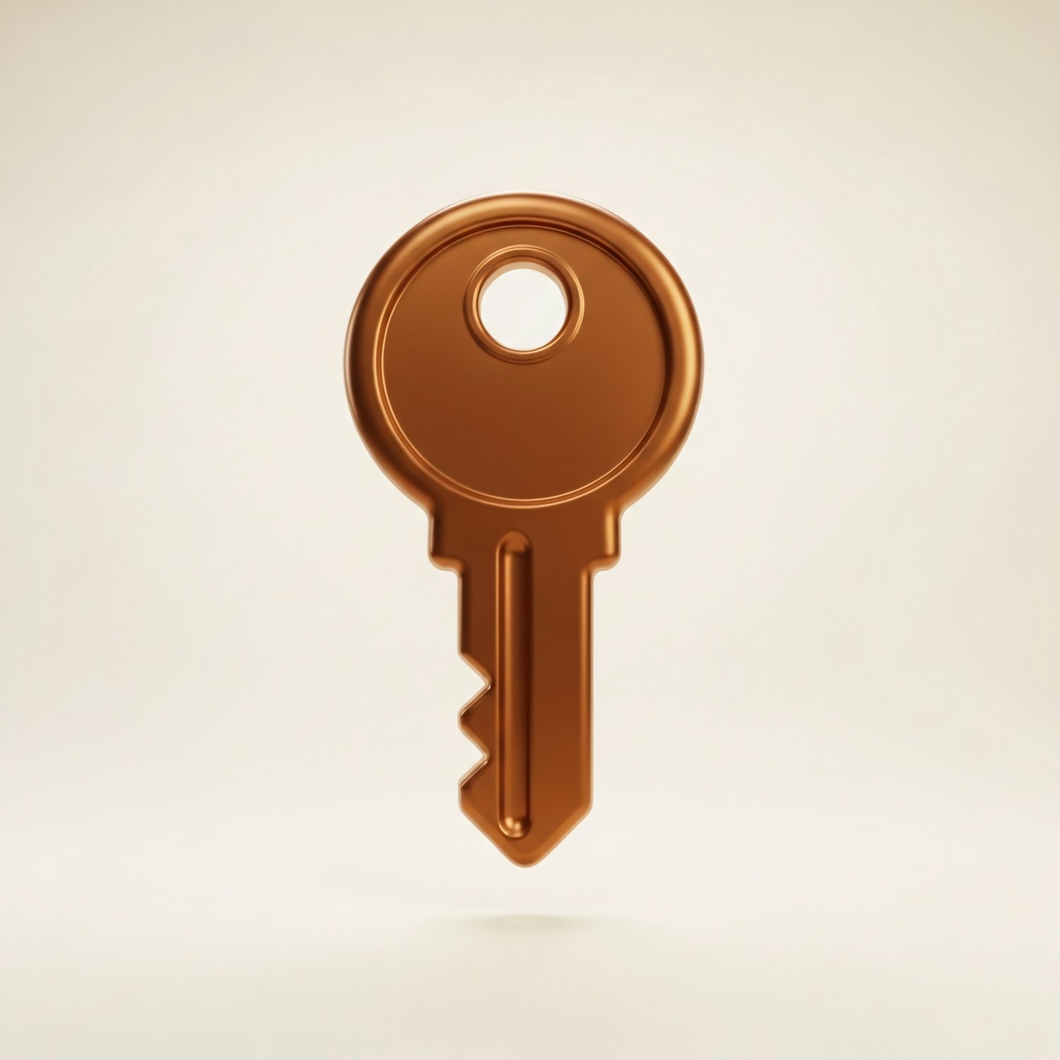 A sleek bronze key with a circular head and notched blade, set against a clean, neutral background, showcasing its polished design.