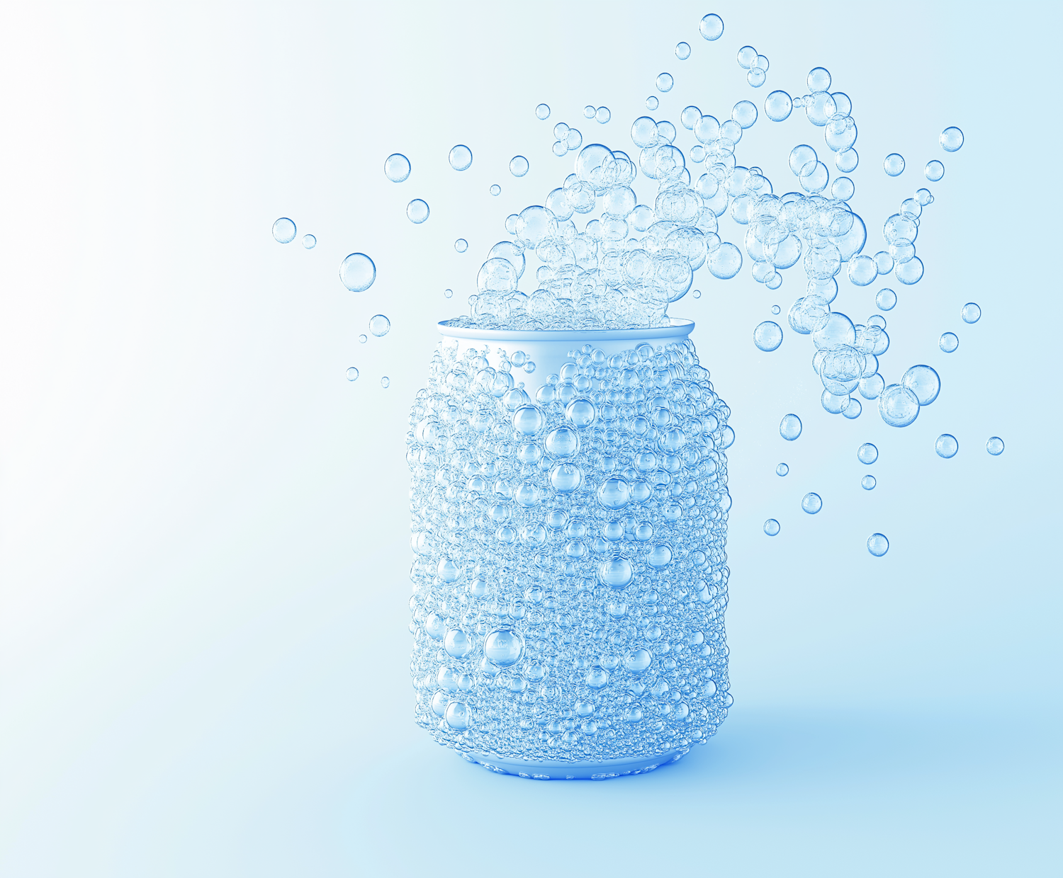 A soda can covered in fizzing bubbles against a light blue gradient background, evoking a refreshing and lively feel.
