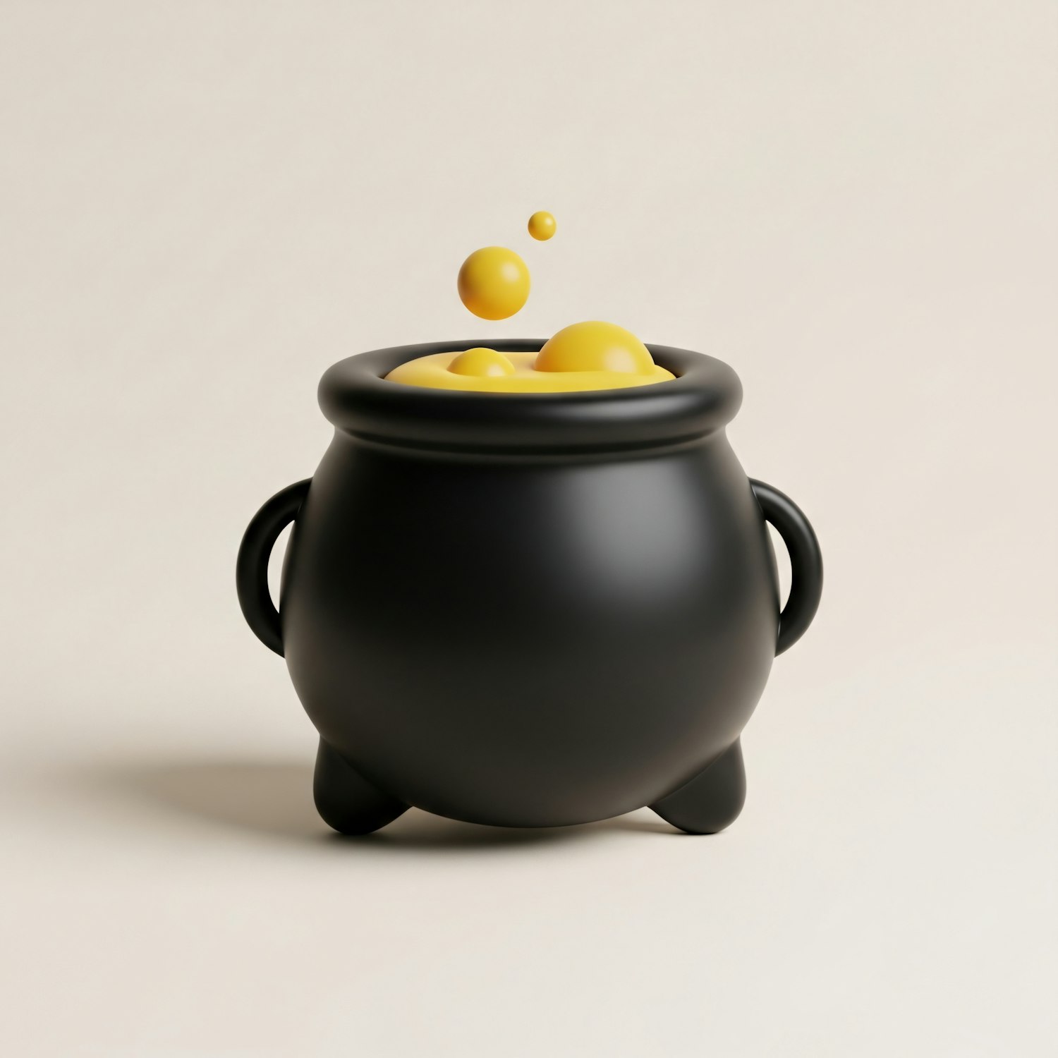 A black cauldron with bubbling yellow liquid on a neutral background, creating a striking and minimalistic visual contrast.