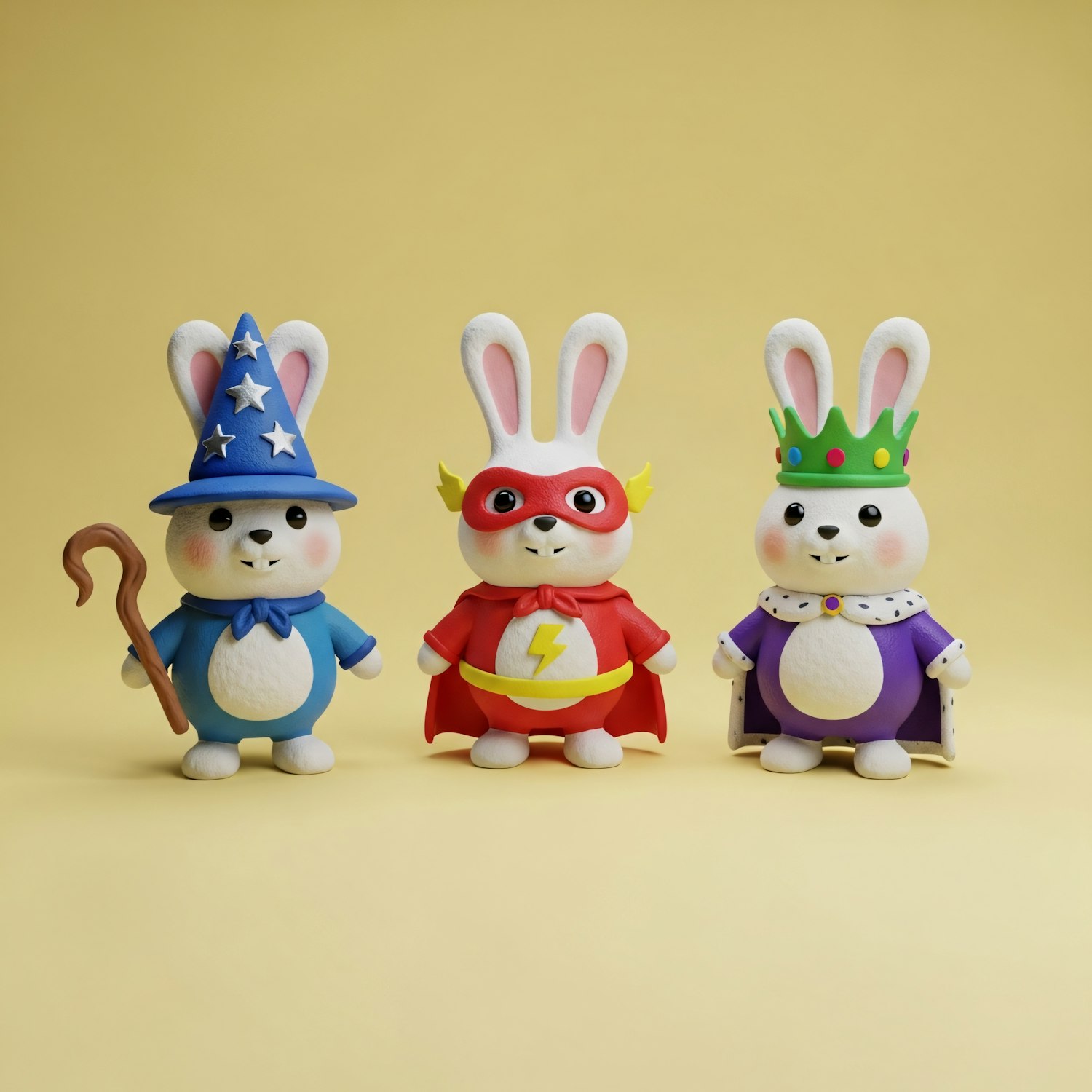 Three cute bunny figurines dressed as a wizard, superhero, and king, set against a yellow background, showcasing vibrant costumes.