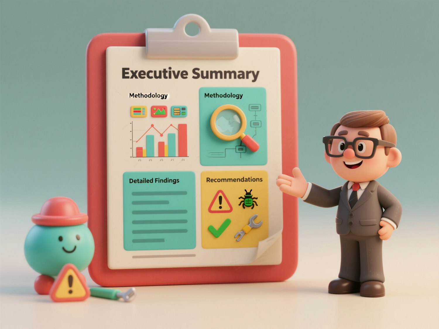 Retro-style cartoon illustration representing a Security Audit Report model. Include a smiling cartoon-style auditor character in glasses and a suit, standing next to a large, opened audit report document split into clear sections: "Executive Summary", "Methodology", "Detailed Findings", and "Recommendations". Each section should show cartoon-style visuals like: a summary chart or dashboard for the executive summary, a magnifying glass and flowchart for methodology, warning signs and bug icons for vulnerabilities, and checkmarks or tools for recommendations. Use vintage cartoon visuals, balanced retro vintage style colors, and a clear educational style. make the report central to the scene.