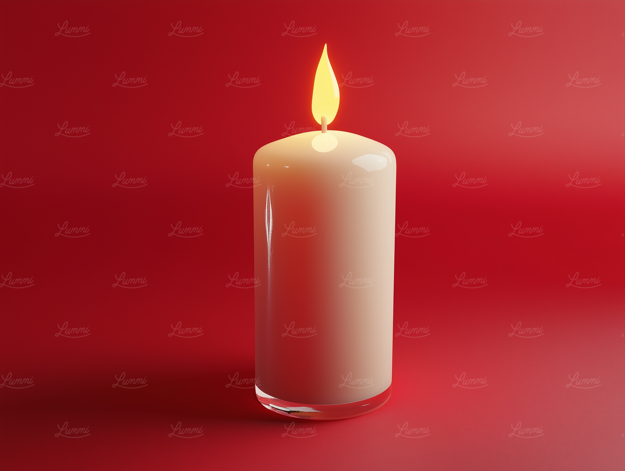A tall white candle with a flickering flame against a vibrant red background, creating a serene and elegant composition.