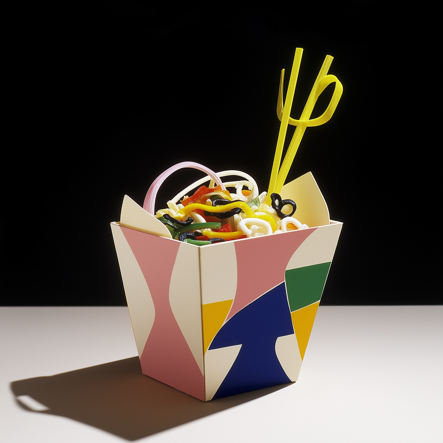 A vibrant takeout box filled with colorful candy noodles and candy chopsticks, set against a dark background for a playful, modern vibe.