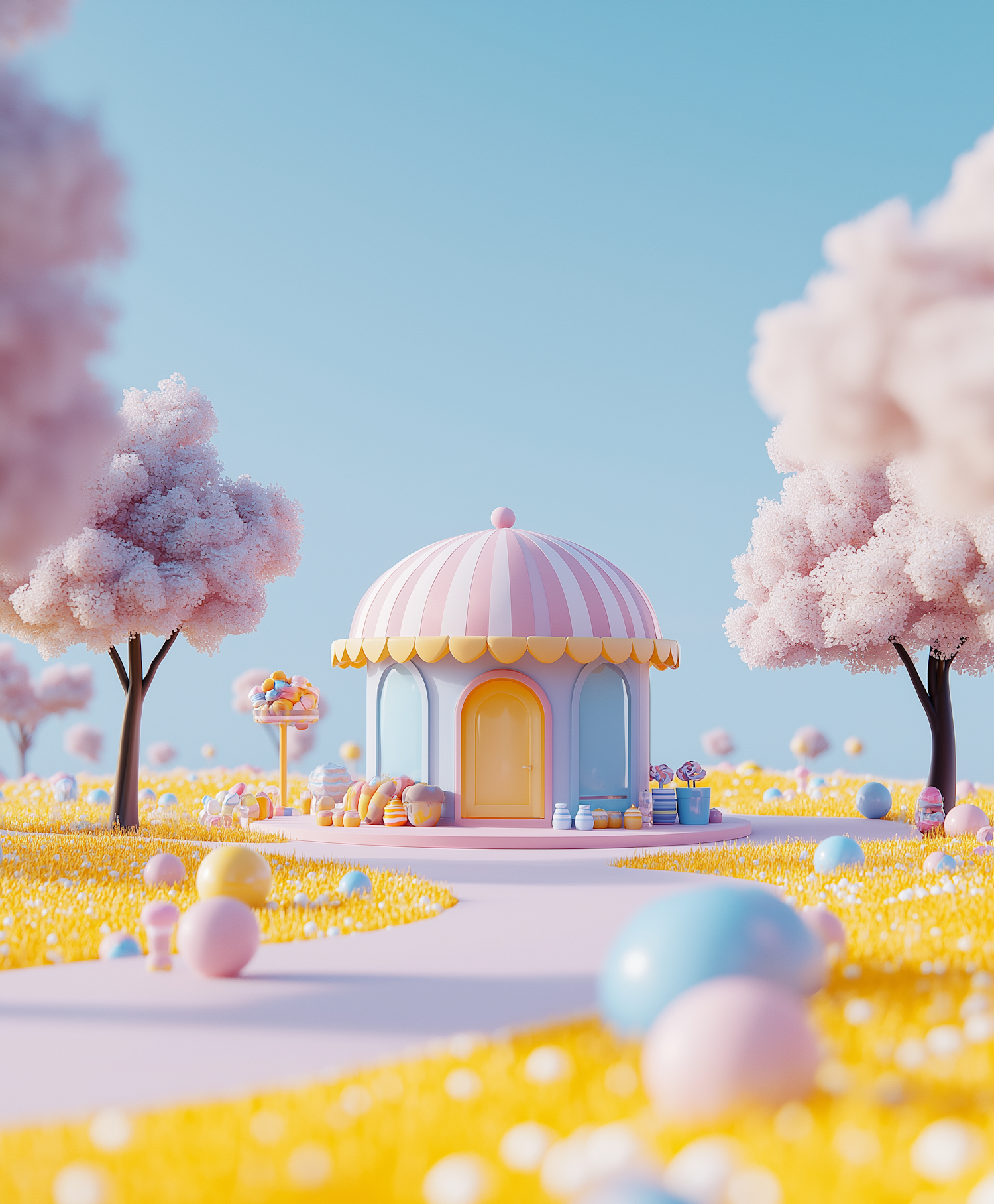 Whimsical candy shop in a pastel landscape with pink trees and colorful candy-like spheres under a clear blue sky.