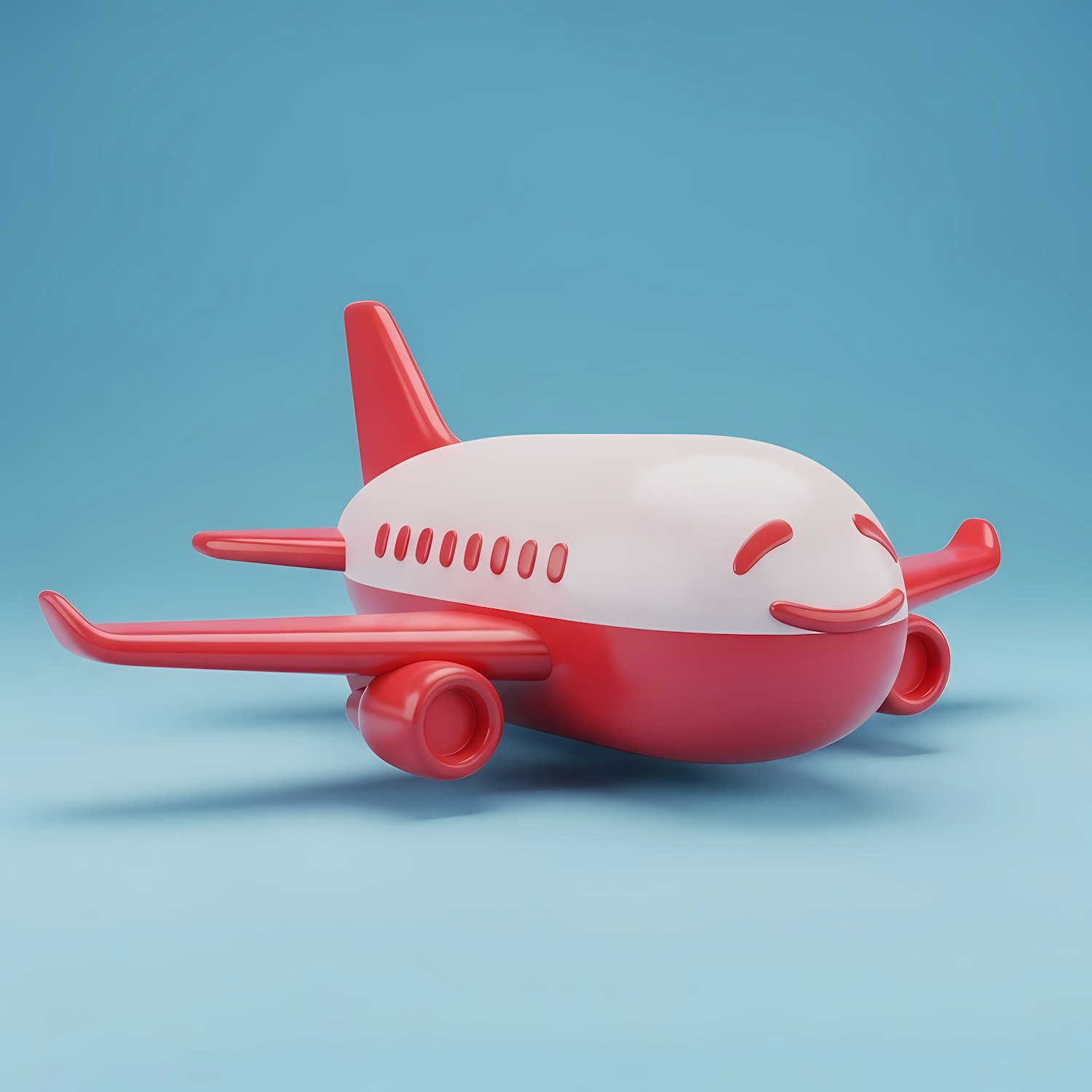 Adorable 3D cartoon airplane with a smiling face, red and white design, set against a bright blue background. Perfect for kids' themes!