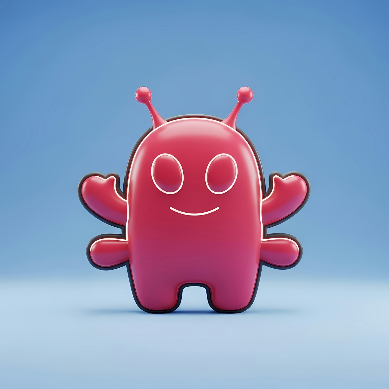 Cute 3D-rendered red alien character with antennae and a friendly smile, set against a light blue gradient background.
