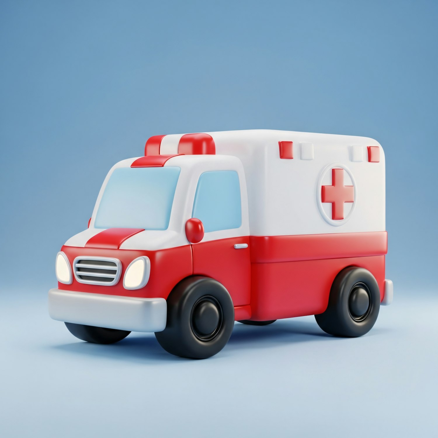 A 3D-rendered toy ambulance with a red and white design, featuring a red cross symbol, set against a clean blue background.