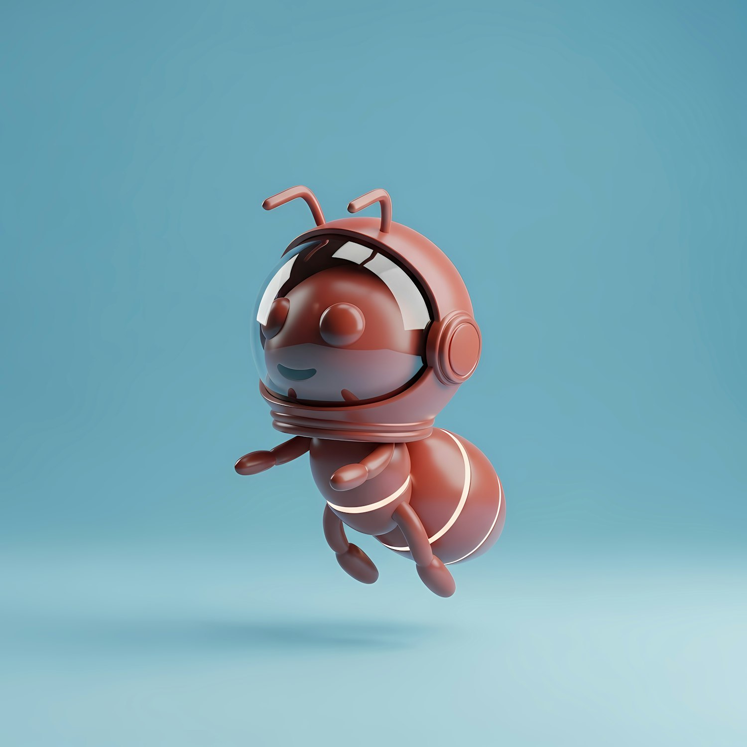Adorable 3D ant astronaut floating in a light blue background, wearing a detailed space helmet. Perfect for whimsical and fun designs.