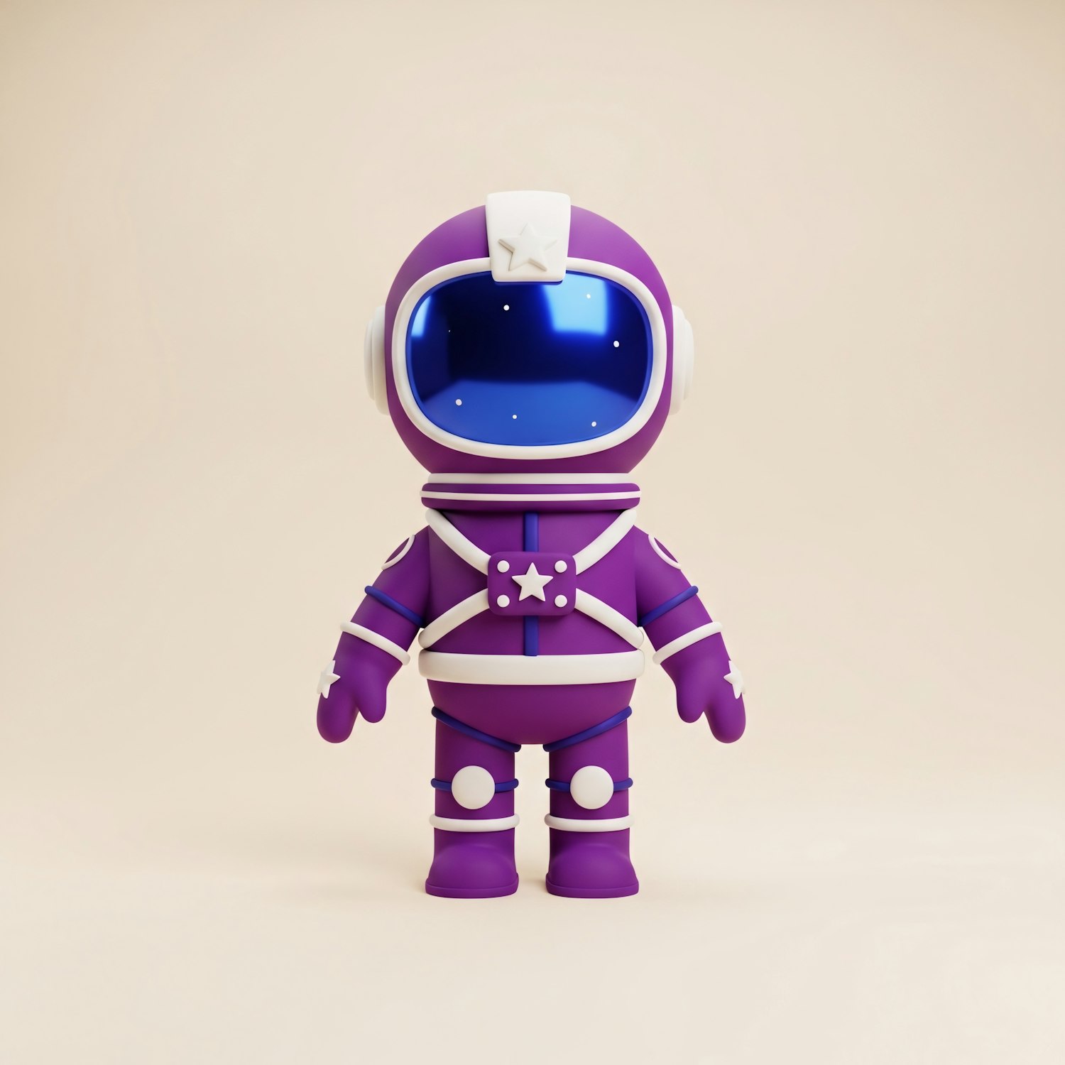A cute 3D astronaut in a purple suit with a starry blue visor, standing against a beige background. Perfect for space-themed designs.
