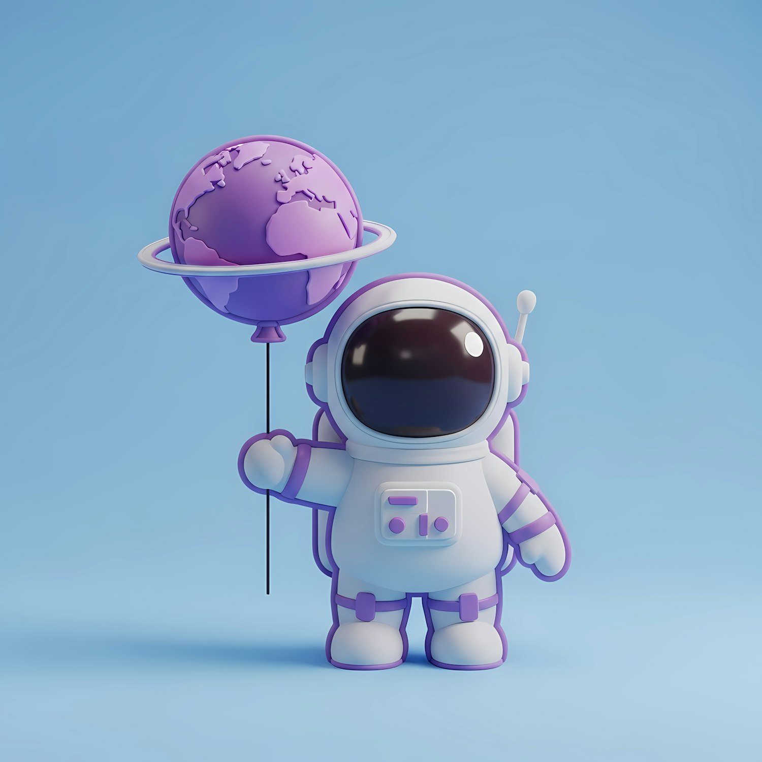 Adorable cartoon astronaut holding a purple globe balloon with a ring, set against a light blue background. Perfect for space-themed designs.