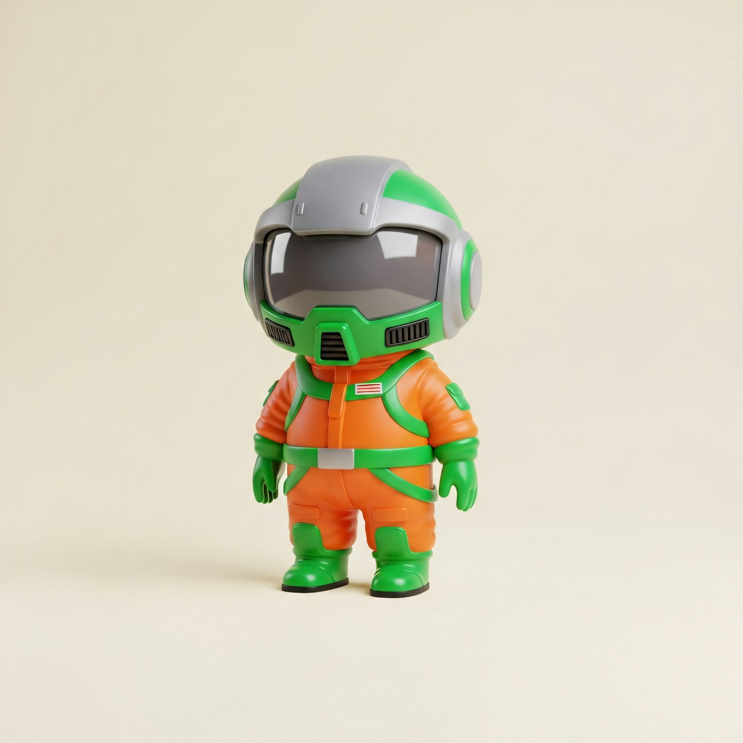 A colorful astronaut toy figure in an orange and green spacesuit with a reflective helmet, set against a neutral background.