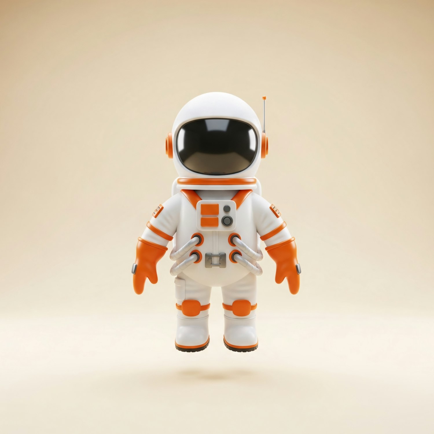 A cute 3D astronaut in a white and orange suit with a glossy black visor, set against a neutral beige background.