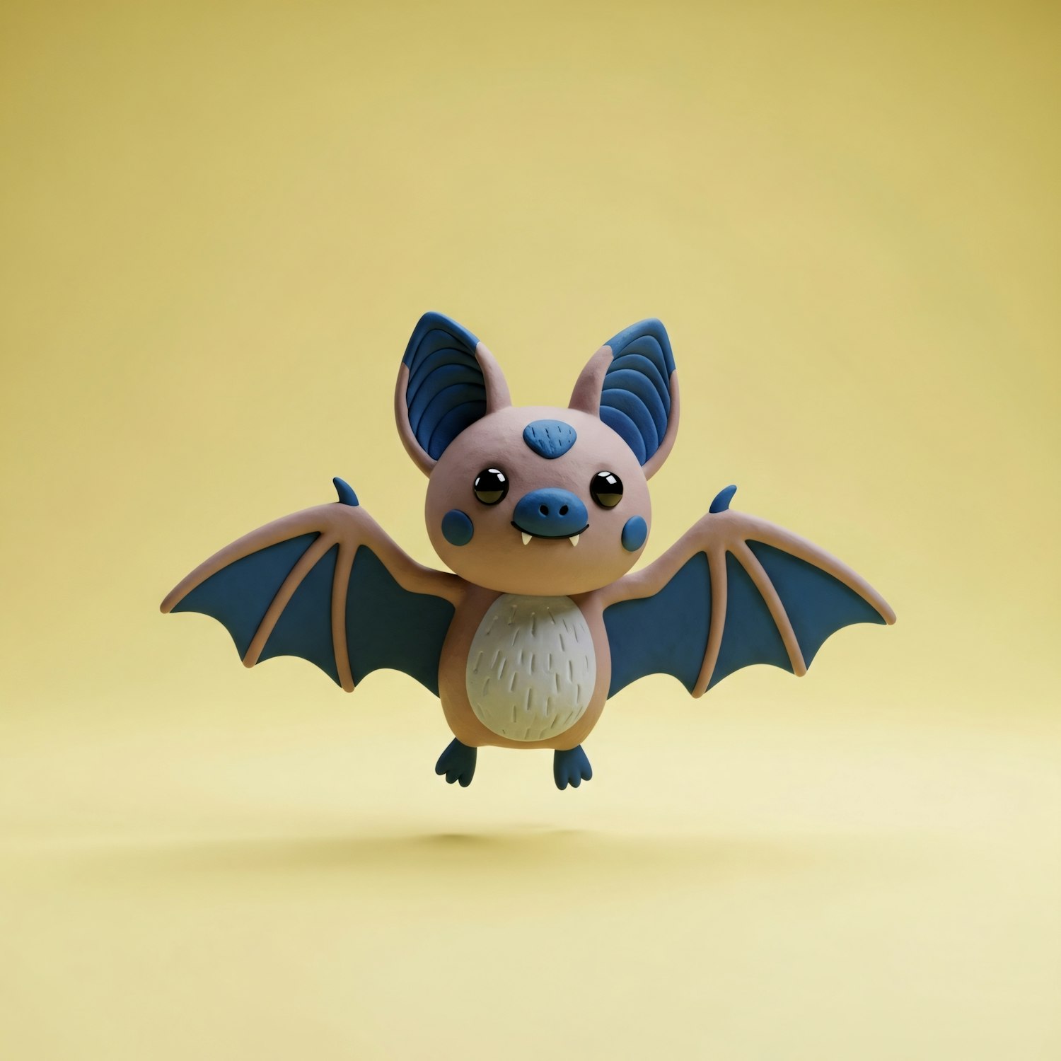 Adorable 3D cartoon bat with big eyes and blue wings, floating on a soft yellow background. Perfect for playful and creative themes.