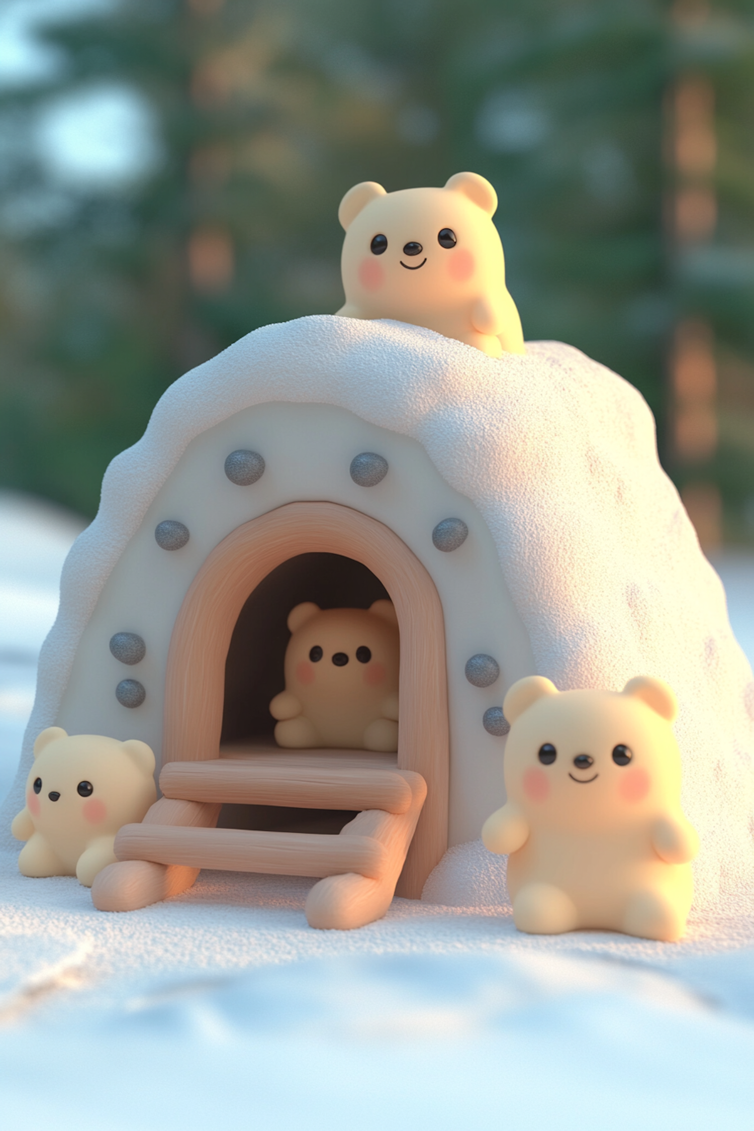 Cute cartoon bears in a snowy igloo setting, with soft pastel colors and a winter forest backdrop.