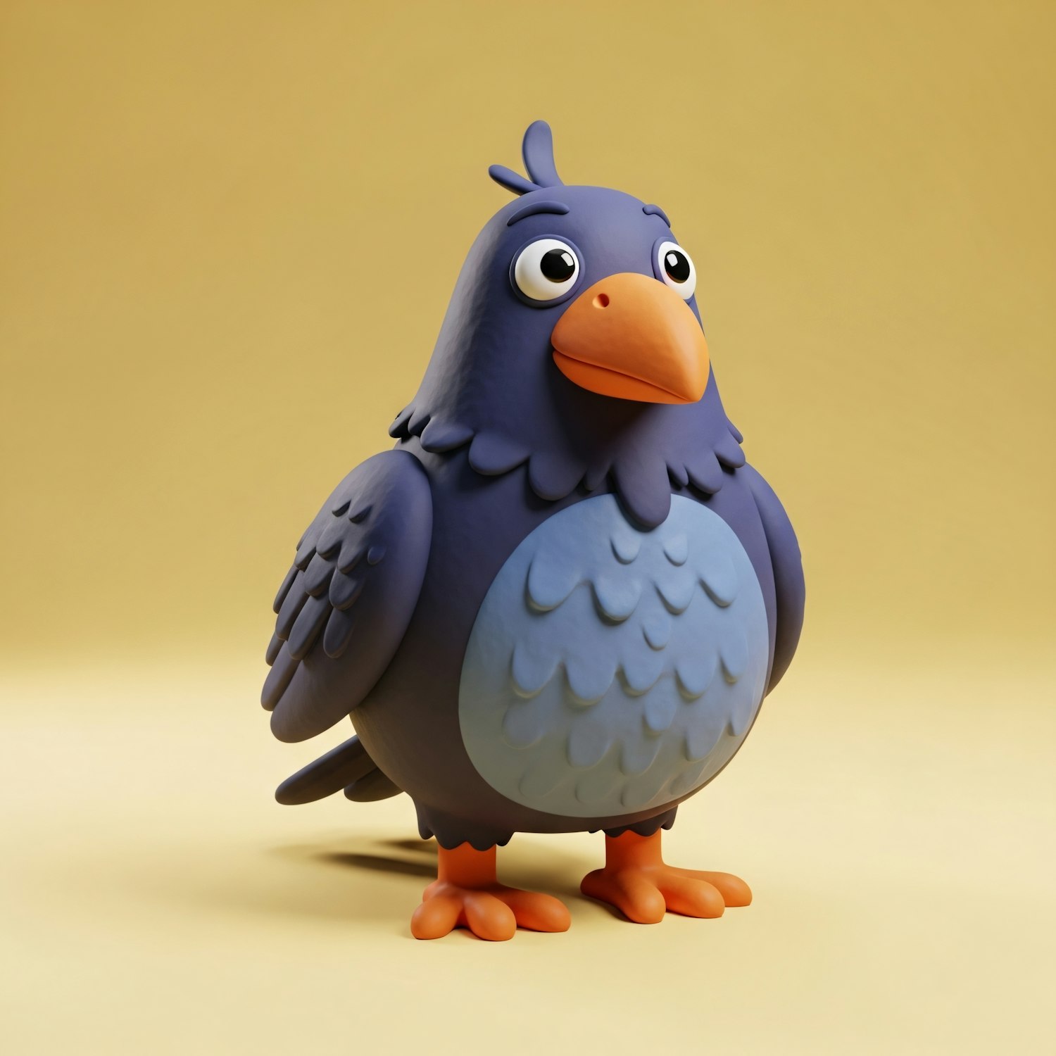 A cute 3D-rendered cartoon bird with blue feathers and an orange beak, set against a warm yellow background.