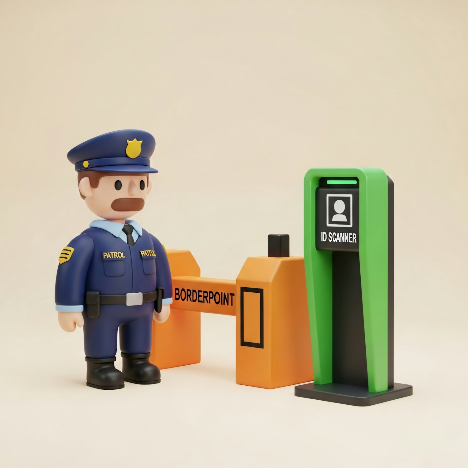 A 3D illustration of a cartoon security officer at a border checkpoint with an ID scanner and barrier, set against a neutral background.