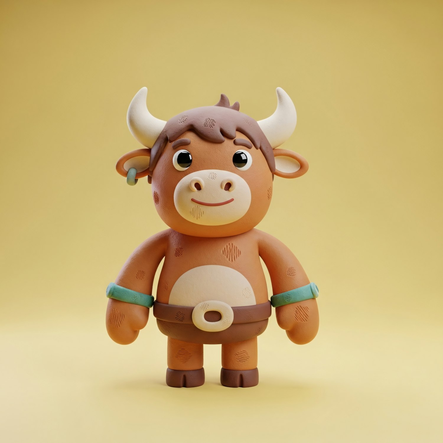 Adorable 3D cartoon bull character with expressive eyes and playful accessories, set against a soft yellow background.