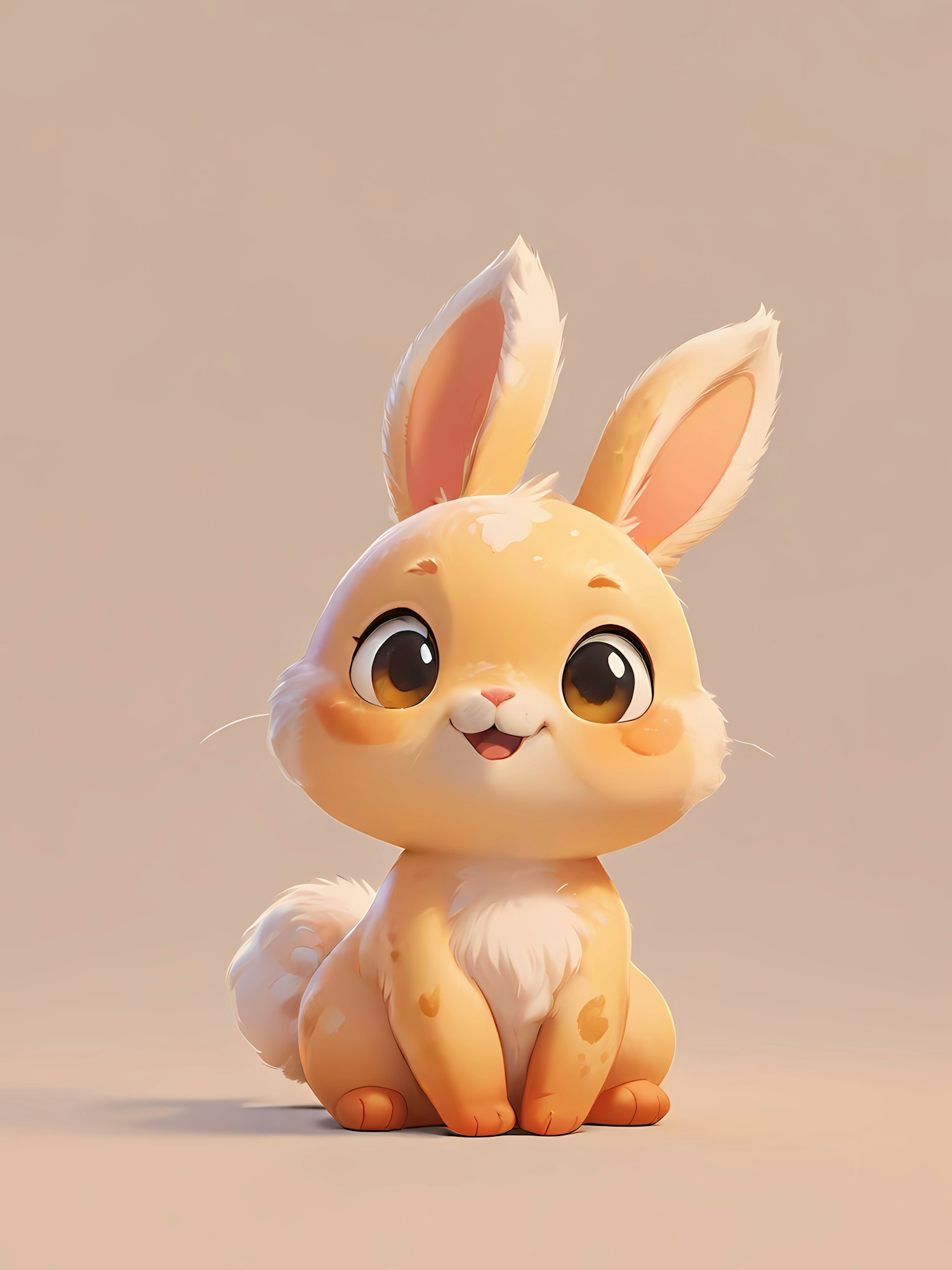 Adorable cartoon bunny with golden-orange fur, big brown eyes, and a cheerful smile, set against a simple beige background.