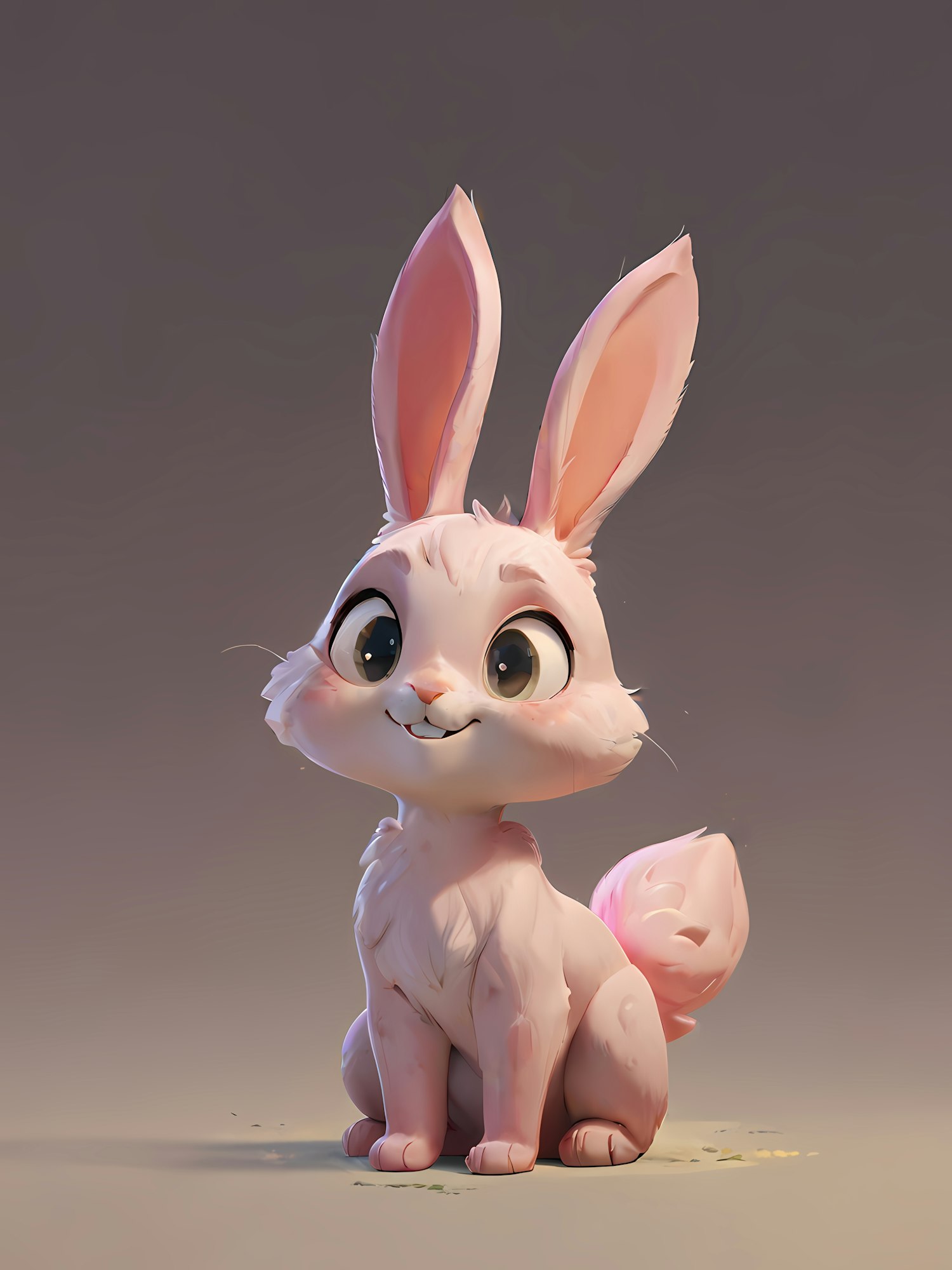 Adorable 3D cartoon bunny with pink fur, big eyes, and a cheerful smile sitting against a neutral background. Perfect for kids' content!
