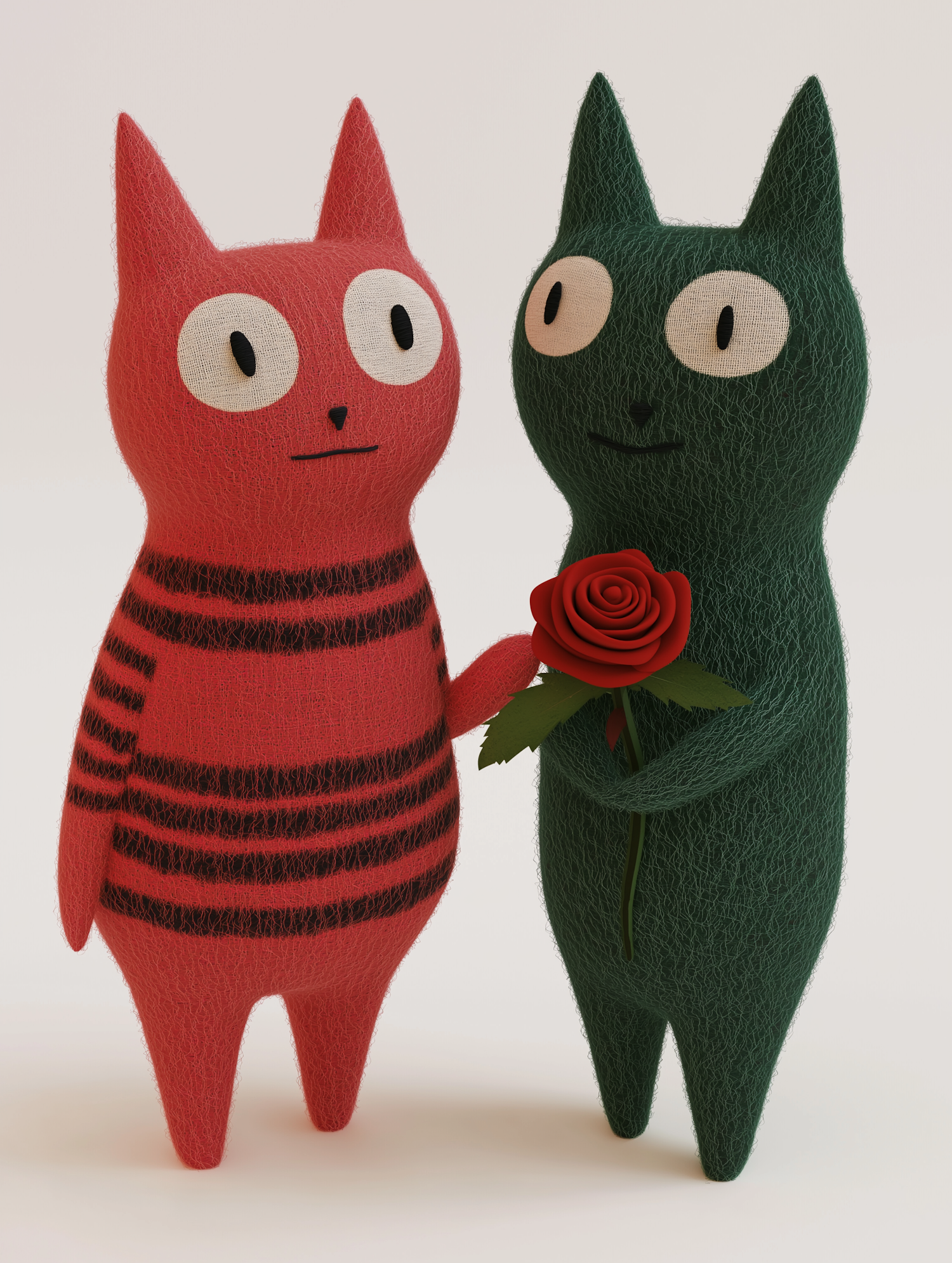 Two cartoon cat-like characters, one red and one green, share a moment with a rose, showcasing friendship or affection.
