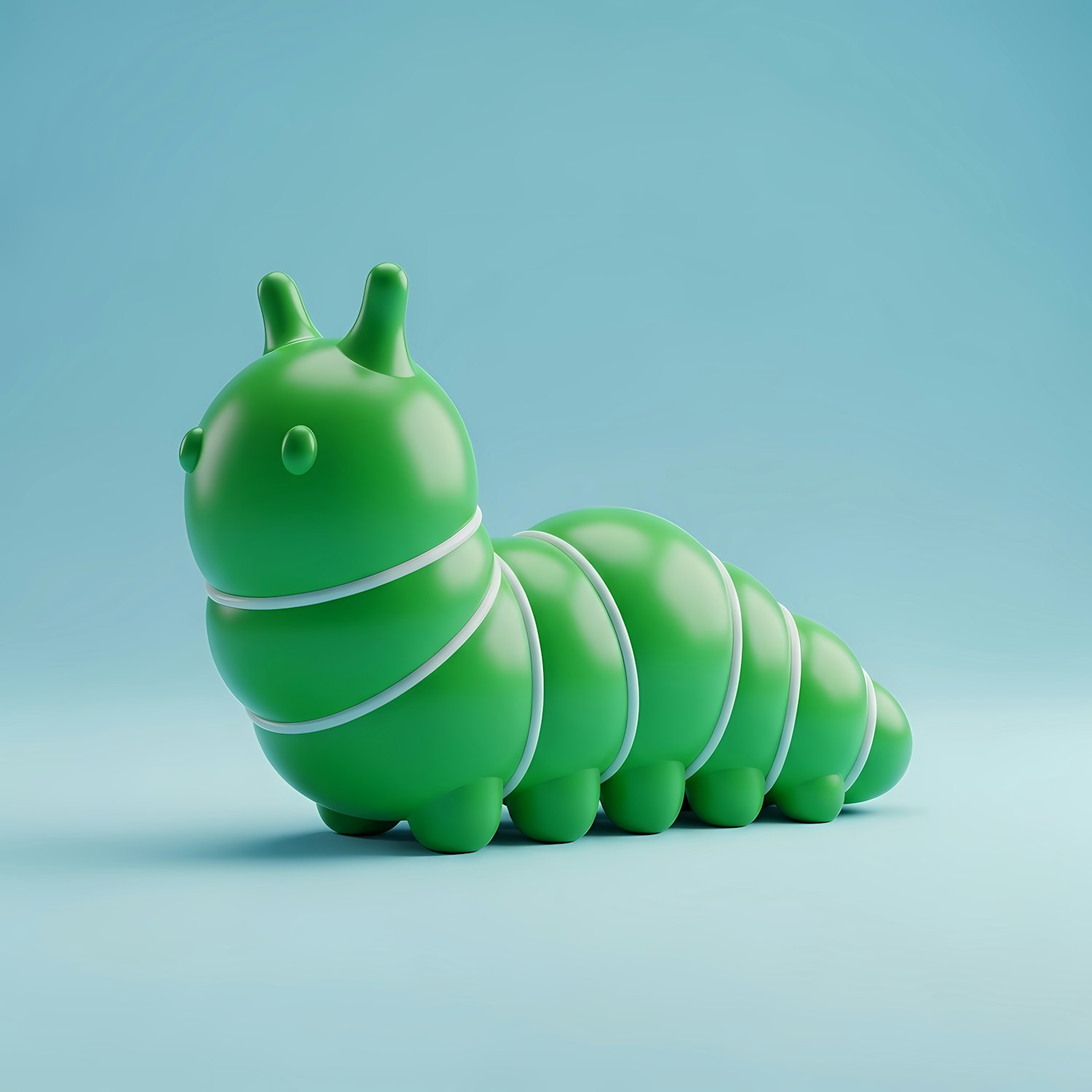 A vibrant 3D-rendered green caterpillar with a glossy finish and a playful design, set against a clean light blue background.